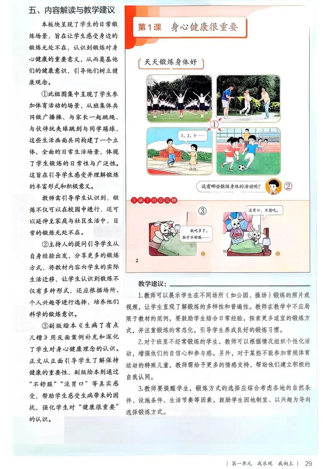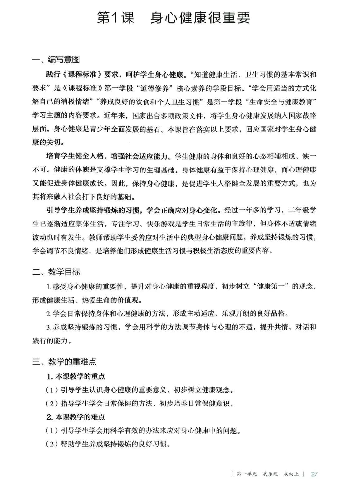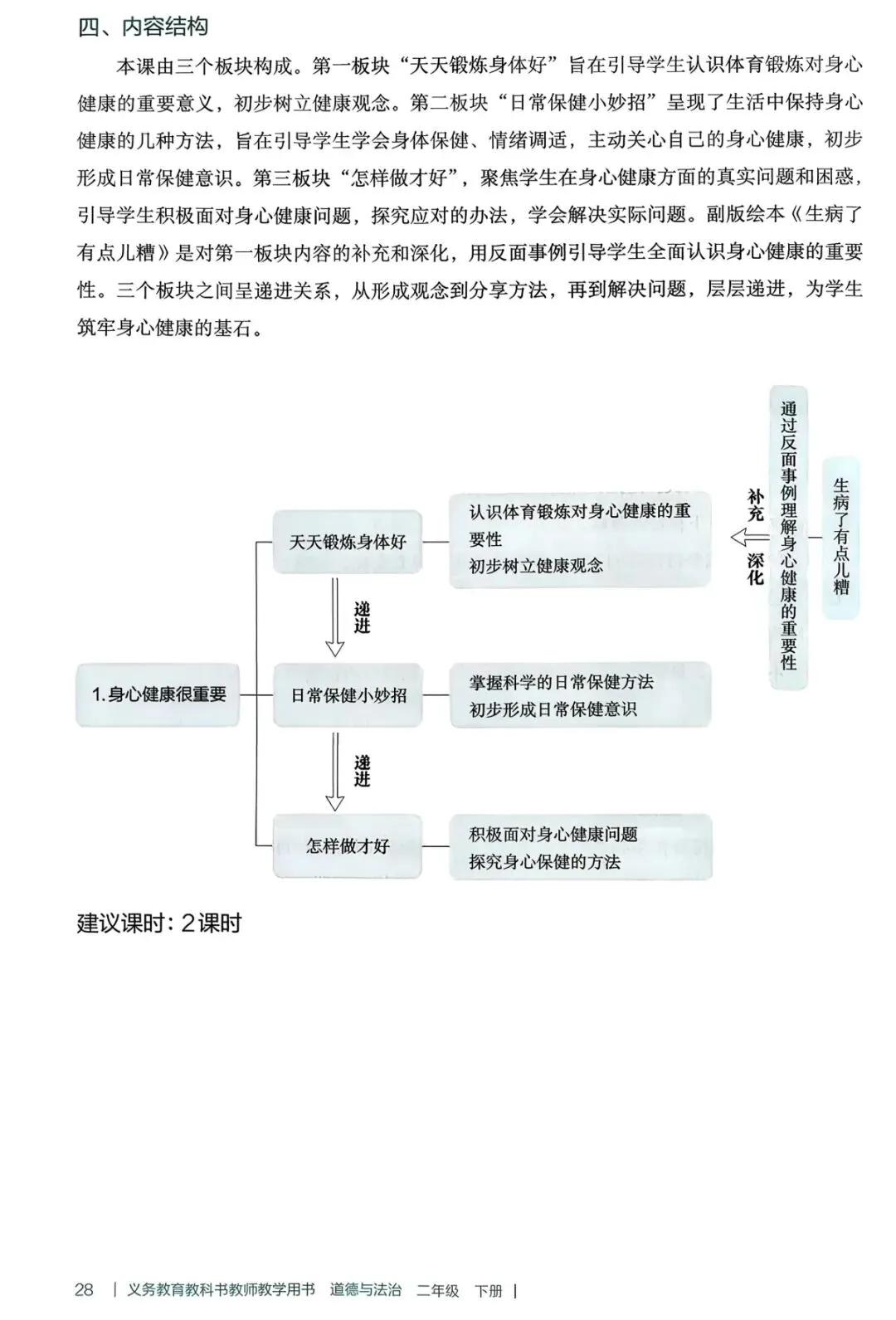 观,领悟“绿水青山就是金山银山”的道理,是小学道德与法治教育的时代责任。我们将生态伦理教育贯穿在教材中,在二年级下册专门设立了“大自然,谢谢您”这一生态伦理教育主题单元,旨在引导学生亲近大自然,理解人与自然相互依存的关系,产生感恩大自然的真实情感,能够与动植物和谐共处,珍惜自然资源。世界卫生组织提出,人的健康涉及身体、心理、社会适应、道德四个方面。中国特色社会主义进人新时代,中国人对美好生活的需要不断提升,对心理健康的关注程度也不断提高。健康的心理品质是培育积极向上的生活态度、高尚的情操和正确的价值观的基础,也是掌握科学知识和技能的重要助力。心理健康构成学生健康成长的重要维度,是全面发展的重要内涵之一。为帮助学生形成健全人格,低段教材在修订中特别关注学生的生活体验,注重引导学生在生活与活动的过程中体验感受,培养其人际交往与沟通能力。如一年级上册第1课《开开心心上学去》,着重进行小学生身份认同教育,以上学的感受为切人点,引导学生形成积极向上的上学态度,鼓励他们结交新朋友。一年级下册设计了“我们一起长大”主题单元,进一步引导学生养成乐群的品格,与同龄人建立互助合作、共同分享的良好人际关系。二年级下册第1单元安排了《身心健康很重要》和《学做“快乐鸟”》两课,旨在引导学生注意日常心理保健和情绪处理。低段教材修订时,我们一方面认真落实《课程标准》的内容与目标要求,另一方面兼顾学科逻辑和儿童成长中遇到的问题。同时,我们充分考虑一线教师学期工作与课时安排的实际情况,根据教学实践,在教材整体结构安排上遵循螺旋上升的编排逻辑。教材编写遵循伦理发展逻辑。《课程标准》强调本课程以“成长中的我”为原点,将学生不断扩大的生活和交往范围作为建构课程的基础,这与中国传统教育强调的“修身齐家治国平天下”理念一致。小学低段《道德与法治》教材以我与自身,我与自然、家庭、他人、社会,我与国家和人类文明的逻辑关系,作为单元顺序安排的依据,引导学生精神不断成长、不断超越。学生是教育的主体。教材关注学生生活和成长中的问题,帮助学生解决问题,助力学生精神成长,这些是道德与法治课程有实效的重要保证。学生生活中的问题和学生成长规律是教材编写的主体线索,也是教材修订的重要依据。例如:根据学生面临的入学适应问题,一年级上册前两个单元安排了人学教育的内容;根据学生在一年级下学期第一个儿童节加入少先队的成长需要,教材安排了“六一”国际儿童节和少先队相关内容的主题教育单元。1.目标设定。教师引导学生结合自身情况,自主设定一个合理的锻炼目标,并写下运动的时间和方式。
