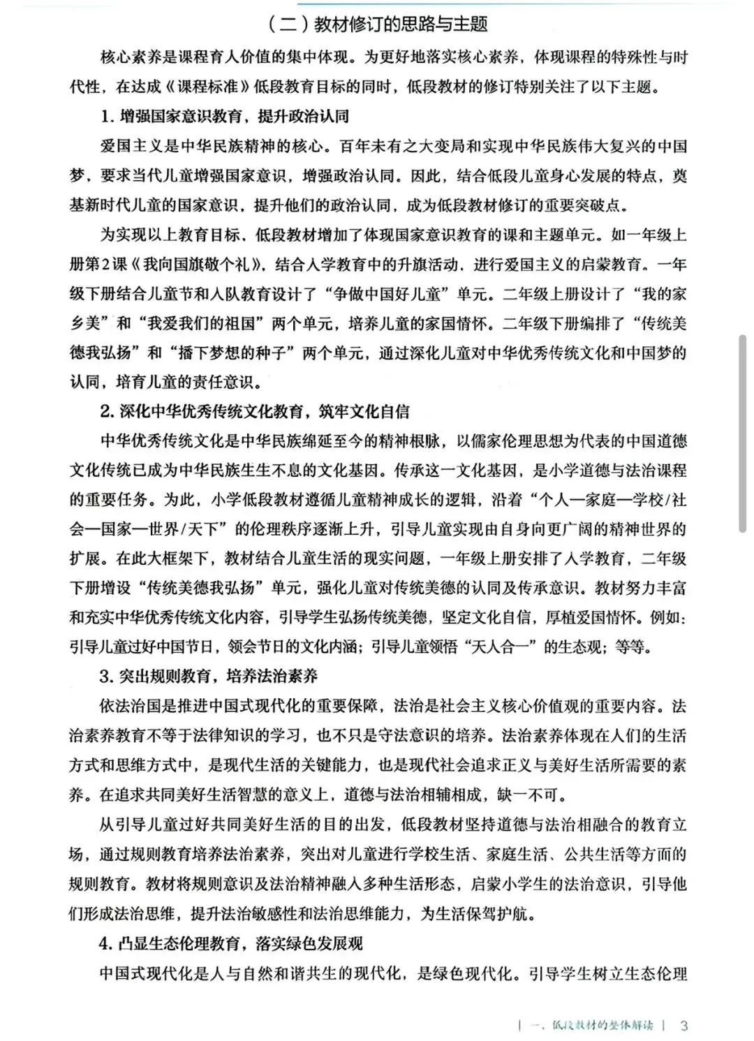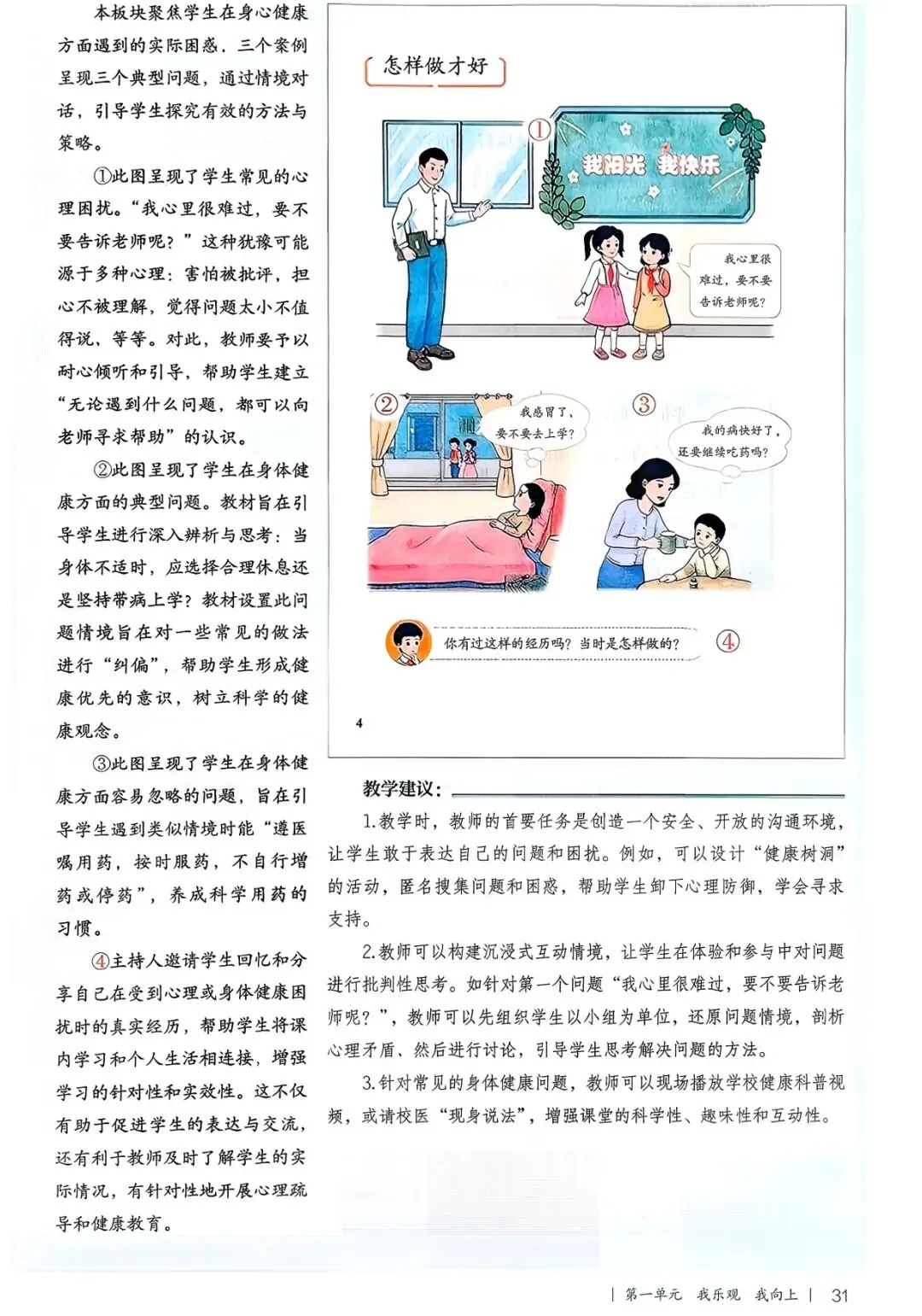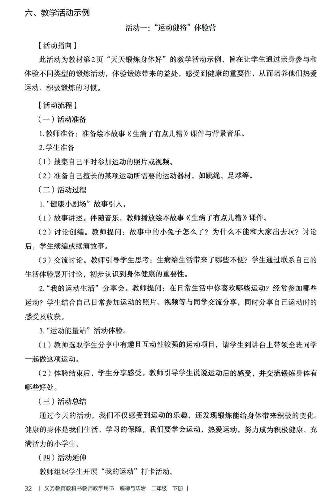 观,领悟“绿水青山就是金山银山”的道理,是小学道德与法治教育的时代责任。我们将生态伦理教育贯穿在教材中,在二年级下册专门设立了“大自然,谢谢您”这一生态伦理教育主题单元,旨在引导学生亲近大自然,理解人与自然相互依存的关系,产生感恩大自然的真实情感,能够与动植物和谐共处,珍惜自然资源。世界卫生组织提出,人的健康涉及身体、心理、社会适应、道德四个方面。中国特色社会主义进人新时代,中国人对美好生活的需要不断提升,对心理健康的关注程度也不断提高。健康的心理品质是培育积极向上的生活态度、高尚的情操和正确的价值观的基础,也是掌握科学知识和技能的重要助力。心理健康构成学生健康成长的重要维度,是全面发展的重要内涵之一。为帮助学生形成健全人格,低段教材在修订中特别关注学生的生活体验,注重引导学生在生活与活动的过程中体验感受,培养其人际交往与沟通能力。如一年级上册第1课《开开心心上学去》,着重进行小学生身份认同教育,以上学的感受为切人点,引导学生形成积极向上的上学态度,鼓励他们结交新朋友。一年级下册设计了“我们一起长大”主题单元,进一步引导学生养成乐群的品格,与同龄人建立互助合作、共同分享的良好人际关系。二年级下册第1单元安排了《身心健康很重要》和《学做“快乐鸟”》两课,旨在引导学生注意日常心理保健和情绪处理。低段教材修订时,我们一方面认真落实《课程标准》的内容与目标要求,另一方面兼顾学科逻辑和儿童成长中遇到的问题。同时,我们充分考虑一线教师学期工作与课时安排的实际情况,根据教学实践,在教材整体结构安排上遵循螺旋上升的编排逻辑。教材编写遵循伦理发展逻辑。《课程标准》强调本课程以“成长中的我”为原点,将学生不断扩大的生活和交往范围作为建构课程的基础,这与中国传统教育强调的“修身齐家治国平天下”理念一致。小学低段《道德与法治》教材以我与自身,我与自然、家庭、他人、社会,我与国家和人类文明的逻辑关系,作为单元顺序安排的依据,引导学生精神不断成长、不断超越。学生是教育的主体。教材关注学生生活和成长中的问题,帮助学生解决问题,助力学生精神成长,这些是道德与法治课程有实效的重要保证。学生生活中的问题和学生成长规律是教材编写的主体线索,也是教材修订的重要依据。例如:根据学生面临的入学适应问题,一年级上册前两个单元安排了人学教育的内容;根据学生在一年级下学期第一个儿童节加入少先队的成长需要,教材安排了“六一”国际儿童节和少先队相关内容的主题教育单元。1.目标设定。教师引导学生结合自身情况,自主设定一个合理的锻炼目标,并写下运动的时间和方式。