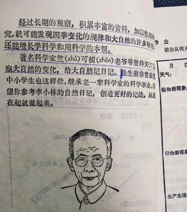 这个栏目叫自然日记,黑线画的老先生头像旁边写着“晴 气温6℃ 南风二级”,我们照着格式记天、记动植物新现象,桃树开花、看见白杨飘絮,一条条往下列,像在给四季上刻痕,爷爷说记就要记准,不会写的字先查字典再落笔。