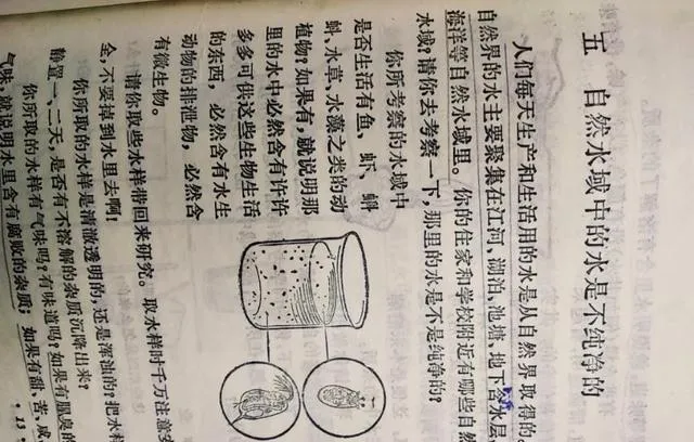 玻璃杯里漂着小点点,旁边配了画圈的草履虫,这页标题一句话就把人勾住了,自然水域的水是不纯净的,我们用纱布捞过水样,拿放大镜看,动得最快的那几只总绕着气泡打转,我当时以为是小鱼苗呢。