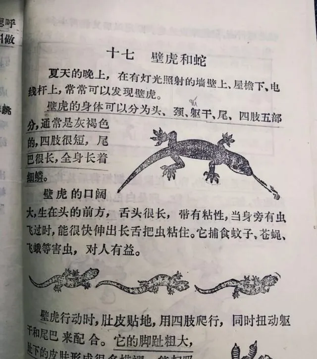 这页最酷,壁虎的脚趾像小扇叶,趴墙不掉,舌头一伸黏住飞蛾,爷爷说老屋里留一只,管用,夏天蚊子少一半,蛇呢,皮鳞一圈圈亮着,虽然害怕,但课本教我们别乱打,分清无毒有毒,再说法子。