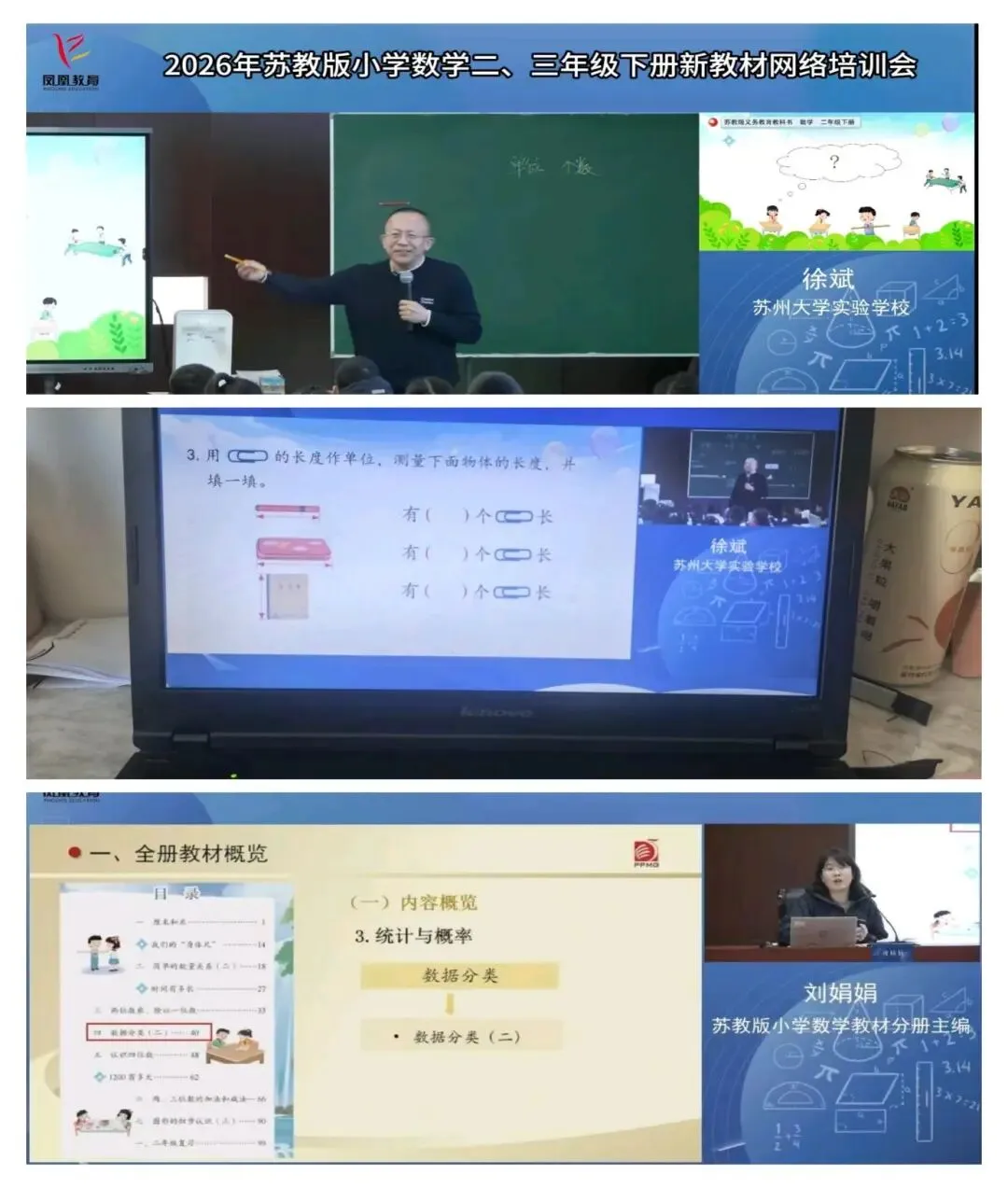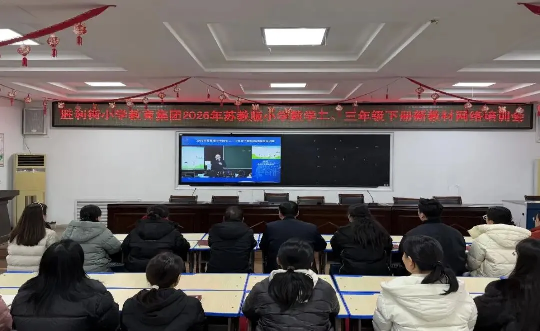为精准把握新教材编写理念与教学逻辑,推动2026年春季学期教学工作平稳落地,胜利街小学教育集团高度重视此次培训,在党支部书记、校长袁国栋的部署领导下,业务副校长程兰超组织全体数学教师于2月2日起系统参与了苏教版小学数学二、三年级下册新教材网络培训。本次培训以“用好新教材、落实新课标”为核心主题,聚焦教材解读与课堂实践双维度,采用“线上观看直播+线下集中研讨”的研修方式,组织教师深入学习,为新教材的高质量实施提供专业支撑。