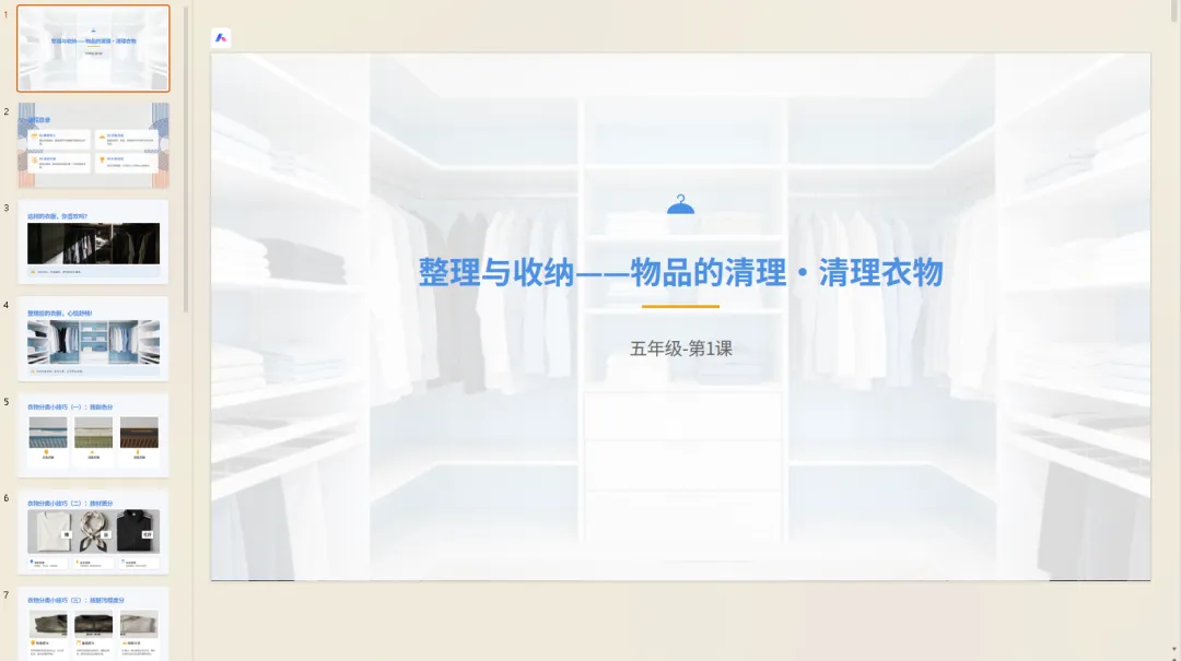 1故事导入:讲述“邋遢大王”的后续故事——邋遢大王学会衣物分类和清理后,不仅衣橱变得整齐,还养成了爱干净的习惯,得到了同学和家人的称赞。引导学生讨论:“邋遢大王的改变告诉我们什么?衣物清理对我们的生活有哪些重要意义?”