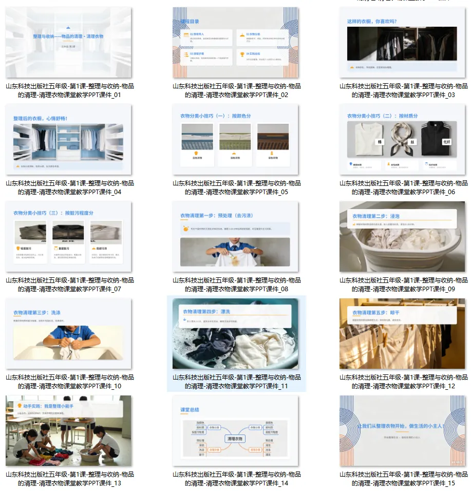 本课选自山东科学技术出版社《中小学劳动实践指导手册》五年级上册第1课,聚焦“整理与收纳”核心主题下的“衣物清理”实践内容。教材以生活需求为导向,将劳动技能培养与生活习惯养成相结合,通过具体操作步骤引导学生掌握衣物清理的基础方法,是衔接小学中高年级劳动教育、培养学生独立生活能力的关键内容。教材注重理论与实践的结合,既强调分类、洗涤等技能的规范性,也关注环保理念与团队合作意识的渗透,符合五年级学生的认知特点和生活实际。