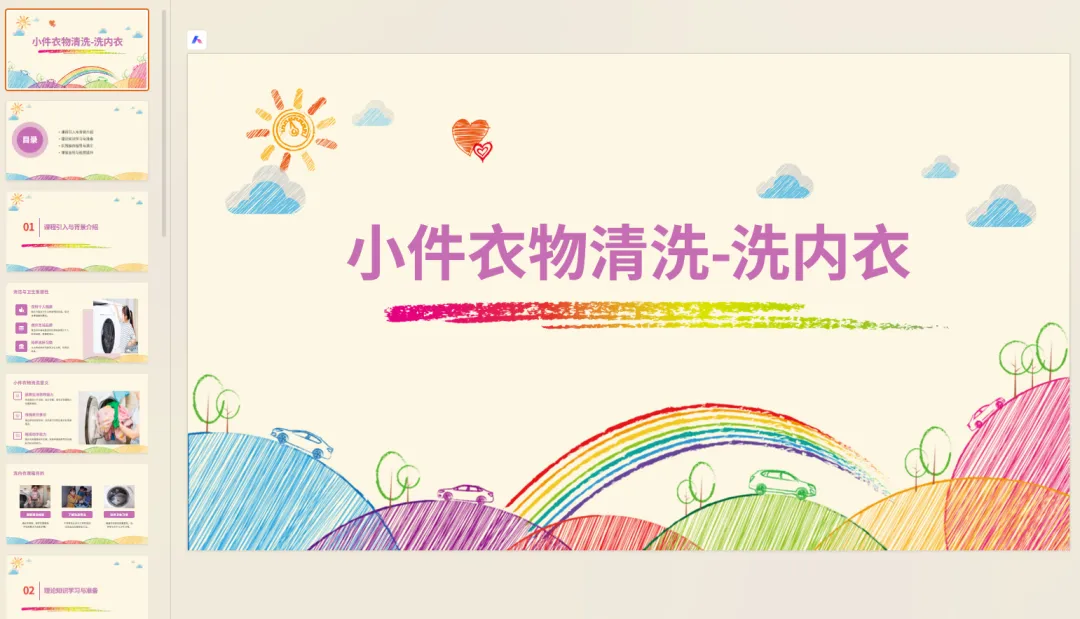 1PPT课件:包含内衣清洗步骤动画、重点部位清洁示意图、注意事项对比图(如温水与热水清洗的差异、单独清洗与混合清洗的区别)。