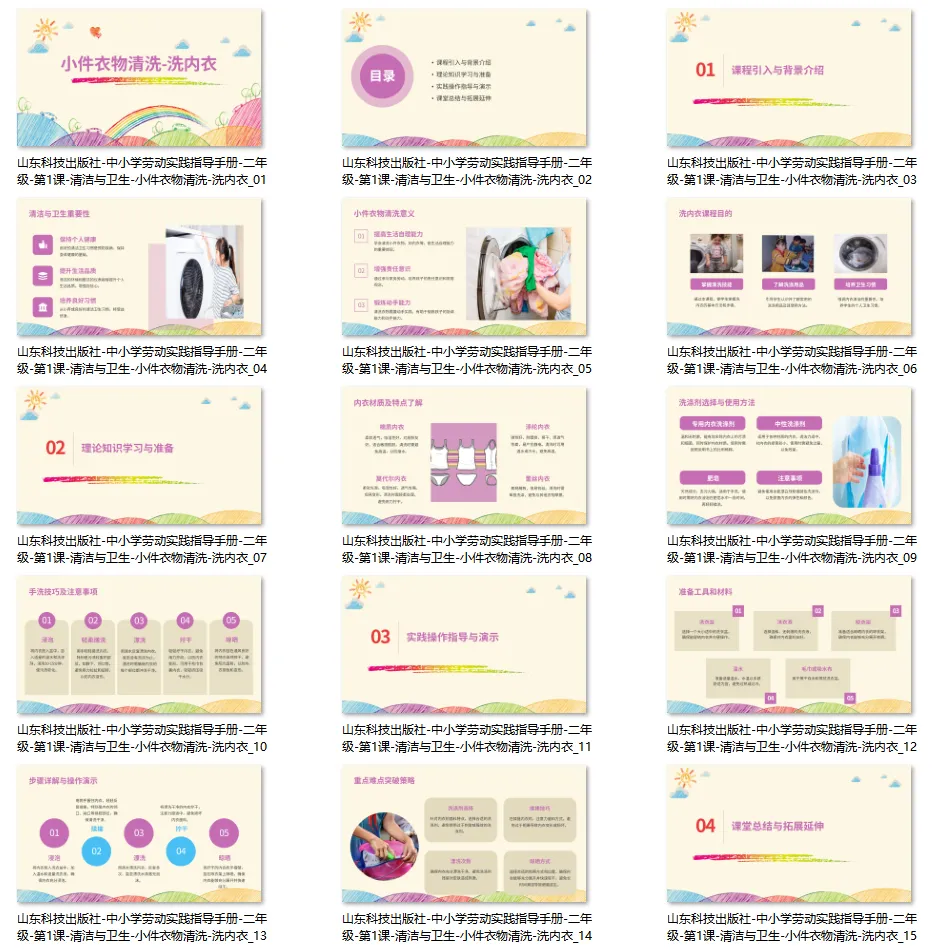 本节课选自山东科技出版社中小学劳动实践指导手册二年级第1课,属于“清洁与卫生”模块中的小件衣物清洗内容,聚焦“洗内衣”这一贴近学生生活的劳动技能。教材以“知识讲解+实践操作”为核心结构,注重劳动教育与生活实际的结合,符合二年级学生认知规律——从具体形象思维向抽象逻辑思维过渡,需要通过直观演示和动手实践掌握技能。本节课是培养学生个人卫生习惯和自我服务能力的关键内容,既是对“清洁卫生”理念的具象化落实,也为后续学习复杂衣物清洗、家庭劳动奠定基础。