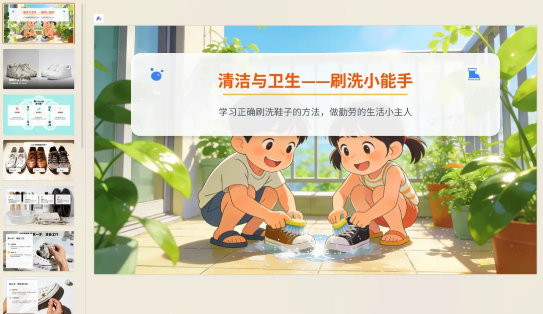 1教师播放精心制作的动画课件,展示刷洗鞋子的完整步骤,边播放边讲解:“第一步,准备工作:把鞋带拆下来单独清洗,用废旧报纸塞进鞋内,防止刷洗时鞋子变形;第二步,预处理污渍:用湿布擦拭鞋子表面浮尘,针对顽固污渍,在污渍处涂抹少量清洁剂,静置1-2分钟;第三步,针对性刷洗:根据鞋子材质选择合适的刷子,顺着面料纹理轻轻刷洗,鞋底缝隙可以用力刷;第四步,冲洗晾干:用清水反复冲洗,直到没有泡沫,然后用毛巾按压吸干水分(不要拧扭),放在通风阴凉处晾干,避免暴晒。”