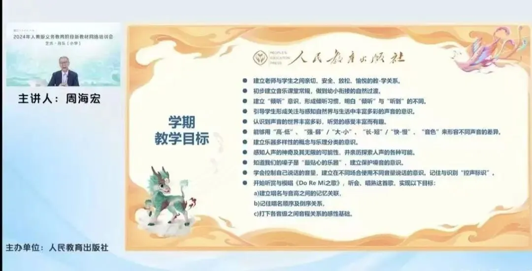 为贯彻国家美育教育新理念,深入理解人教版音乐新教材的编写理念,准确把握教学方向,探索核心素养在课堂中的有效实施路径,提升音乐教师的专业素养与教学实践能力。2026年2月2日,郓城县各小学音乐教师纷纷参与线上培训,牢牢夯实教材研习的根基,为后续备课研讨筑牢实践认知基础。周海宏教授结合低年级学生身心发展特点,阐述了新教材的编写深度运用了心理学原理,其根本目标是唤醒学生心灵的自由与创造力。音乐教育不再是孤立的唱歌、识谱,而是通过音乐培养学生的审美感知、文化理解、情感表达等核心素养。这要求教师转变角色,从知识的传授者变为学生音乐学习活动的设计者、引导者和陪伴者。