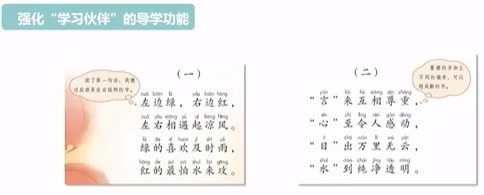 第二就是强化学习伙伴的导学功能。我们教材里面的学习伙伴,它是助学系统的重要组成部分,承担着激发学习兴趣、点播学习方法、引导拓展实践等等多重功能。那么教材在修订的时候,进一步强化了这些功能,以更好的帮助学生学习。比如一年级下册《猜字谜》,它在两则字谜旁边都增加了学习伙伴的提示,提示学生字的结构或者是猜谜的思路,有效的降低了学生猜字谜的难度。