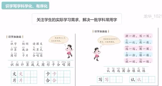还有一点,就是明确栏目性质,整合语文园地。要提升学生的语文核心素养,关键是要提升语言运用能力。那如王宁老师指出,语文教学必须以语言运用为本,这是出发点与落脚点。通过语言运用的教学,把语文核心素养的其他三个方面,也就是文化自信、思维能力和审美创造带进来,彼此融为一体,在不断的语言实践当中得到综合提升。语文园地,是语言运用的重要载体。为了让它的综合运用的功能更加凝聚,一年级教材把原来独立的口语交际栏目并到语文园地当中,使语文园地能够更好地发挥听说读写、综合复习的功用。同时,教材对语文园地内部的栏目也进行了适当的调整,把查字典并到识字加油站,修改之后能够更加凸显查字典用于识字的工具性。并且我们可以看到,在学完查字典的方法之后,让学生去真实的运用这个工具,去认识一些汉字,真切的体会到字典对于识字的作用。语文园地还把我的发现调整到字词句运用栏目,进一步明确这个栏目对语言规律的梳理、探究、运用的属性。这样整合,一是避免栏目太过琐碎,二是从本质上来说,他们也是属于自词句运用的范畴。三是这个题目提供给学生一种在生活当中识字的途径,引导学生在生活中多关注、多积累。再比如语文园地5,这是之前的我的发现,现在加上题干并到了字词句应用栏目里面。对于从我的发现并过来的这些题目,我们还做了一个小小的改造,像这个题目以前是只有一个泡泡引导学生关注形声字形旁表意的规律,现在我们看又增加了一个新的泡泡说,我还知道其他和身体有关的偏旁,比如病字旁。这样就不仅仅局限于发现规律,还把发现的规律应用到认识的其他汉字上。学生通过探究规律和方法,不仅能够批量的、高效的识字,并且能对汉字的自理有初步的感悟。第三点,整合单元内容,安排拓展活动。统编教材中高年级语文园地的交流平台,我们修订后更名为梳理与交流,它引导学生回顾单元内容,交流学习方法,在实际使用中有很好的教学效果。那么在这次修订中,低年级教材也借鉴了这个思路,从一年级下册开始,每册选择两个单元,在单元全部内容之后安排拓展活动,对单元内容进行梳理与交流,显性的体现单元的整体性。拓展活动以学习伙伴对话的形式呈现。我们来看看一下的两次拓展活动,这两次拓展活动,分别安排在第三单元快乐伙伴和第七单元养成好习惯。第一个学习伙伴引导学生回顾单元内容,说课文中的小朋友真开心,真是怎么都快乐。七单元学习了这几篇课文,我知道养成好习惯很重要。那么第二个学习伙伴,引导学生联系生活,加强对单元主题的理解。第二个学习伙伴说:“我想到了我和小伙伴之间发生的有趣的事,我来给大家讲一讲吧。我还知道其他的好习惯,我们一起交流一下”,这样就不仅梳理和总结了单元内容,帮助学生从整体上把握单元主题,而且还从课本延伸到生活,使学生领悟到课文学习与个人生活的相关性,从而深化对单元主题的理解。接下来呢,我们就看一看每个板块的主要内容和特点。还是分成三个板块来谈,识字、写字、阅读和交际。首先识字写字。我们调整了识字写字的序列,努力实现科学化、有序化。汉字学家王宁老师说过,提高教学质量的关键是选择好初期积累的字,也就是选择第一批次来突破零。这一批次必须是比较容易的,同时还应当是能够更有效的带动以后的学习。一年级下册教材在一年级上册的基础上,持续优化自主的选择和秩序的排列,力求科学。遵循儿童学习语言的规律呢,要求认的字都是常见的,出现频率高的口语常用词。要求写的字呢,大多是字形简单、特别常用的字,其中合体字的部件力争是已经写过的独体字。按照由易到难,由简到繁,由独体到合体的顺序来排列。为了优先安排常用字,除了根据这个原则调整原有生字教材,还积极的进行人工干预,新编了一批识字加油站。我们为什么要编写这些识字加油站呢?我们来看看课程标准,这是课程标准后面的一个附表,识字写字教学基本字表,这里有最基本的300个汉字。这些字构型简单,重现率高,其中的大多数能成为其他字的结构成分。先学这些字,有利于打好识字写字的基础,有利于发展识字写字能力,提高学习效率。其中有些字呢,它是不容易随文出现的,我们就把这些字设法的放到不同的情境当中,让学生去认识和书写。那么情境中不容易安排的字,我们也会通过引导学生学习识字方法来识记这些字。比如语文园地3的识字加油站,在学习音序查字法之后,让学生运用方法查字典,安排了300字中的米、纸、金、寸、丁等等这些字,不仅体现了方法的学以致用,还编入了一批不易随文出现的基本字。同时这些字经常作为部件在合体字当中出现,比如说金这个字,它就出现在一大批常用字之中,比如新旧的新,所以的所,不断的断,斧子的斧等等。及早的认识这些字,对于学生的后续学习是非常有价值的。在字种选择上,教材还关注到学生的实际学习需求,解决一批学科常用字。一年级学生面临适应新环境和学习新知识的双重挑战,不同学科教材中的生字会对他们的学习和理解造成困扰。为了帮助他们更好的跨越这个障碍,在修订中对其他学科教材进行了梳理,将其中出现频率高的词语和学习要求编入语文教材。一年级下册,我们调整了两个识字加油站。语文园地一安排了不同学科学习中的常见词语,我们