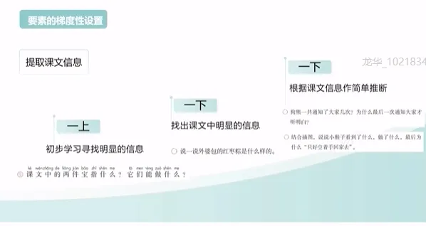 我们再以提取信息为例,一年级上册的语文要素是初步学习寻找明显的信息。所谓初步学习呢,就是引导学生去识别、理解词语和简单的句子,找出文本中的直接信息。教材在学生学习阅读的初级阶段,采用了把文本和问题答案直接关联的方式,以此来帮助学生掌握提取信息的基本技巧。那么一年级下册第四单元要求学生找出课文当中明显的信息,这时候课文篇幅就加长了,需要提取的信息是藏在课文的一个自然段当中,增加了获取信息的难度。第七单元则要求学生根据课文信息做简单的推断。《动物王国开大会》的课后练习是,狗熊一共通知了大家几次?为什么最后一次通知大家才听明白?《小猴子下山》的口语练习,说说小猴子看到了什么,做了什么,最后为什么只好空着手回家去。这两个题目它的思路是一致的。第一个小问题,先让学生运用已经掌握的方法去提取信息。第二个小问题,引导学生对这些信息稍作整合分析,进行推断,初步培养学生的思维能力。所以我们看教材就是借助这些安排,为学生规划了更加清晰合理的语文学习路径。通过加强要素之间的关联性和梯度性,循序渐进地促进学生的语言能力逐步提升。
