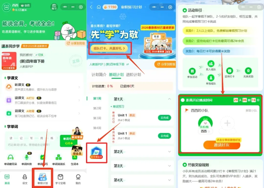 现在孩子邀请好友或同学,2人组队即可免费解锁【寒假预习计划】全部内容,只要组队打卡21天!即可获得英语朗读宝会员!组队人越多,奖励越多,最高可得2年年卡!