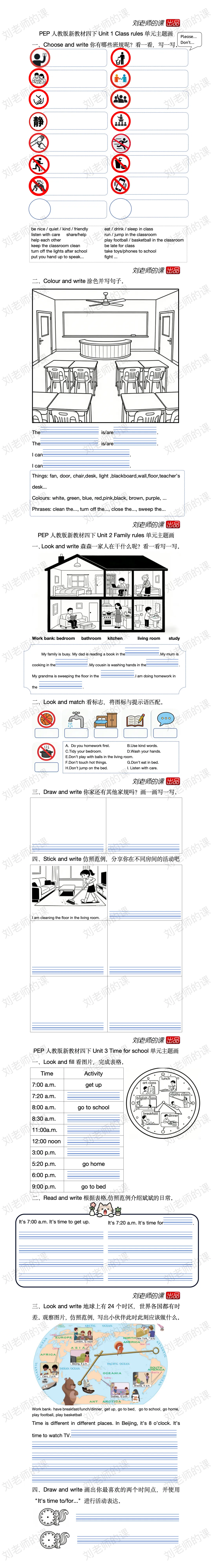 PEP人教版四下前三单元的主题画作业纸