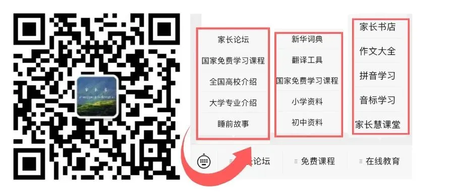 九大学习工具,都在家长慧。关注家长慧、关注孩子成长!长按下方家长慧的二维码,进入公众号,点击底部菜单获取各大学习工具!(如下图)