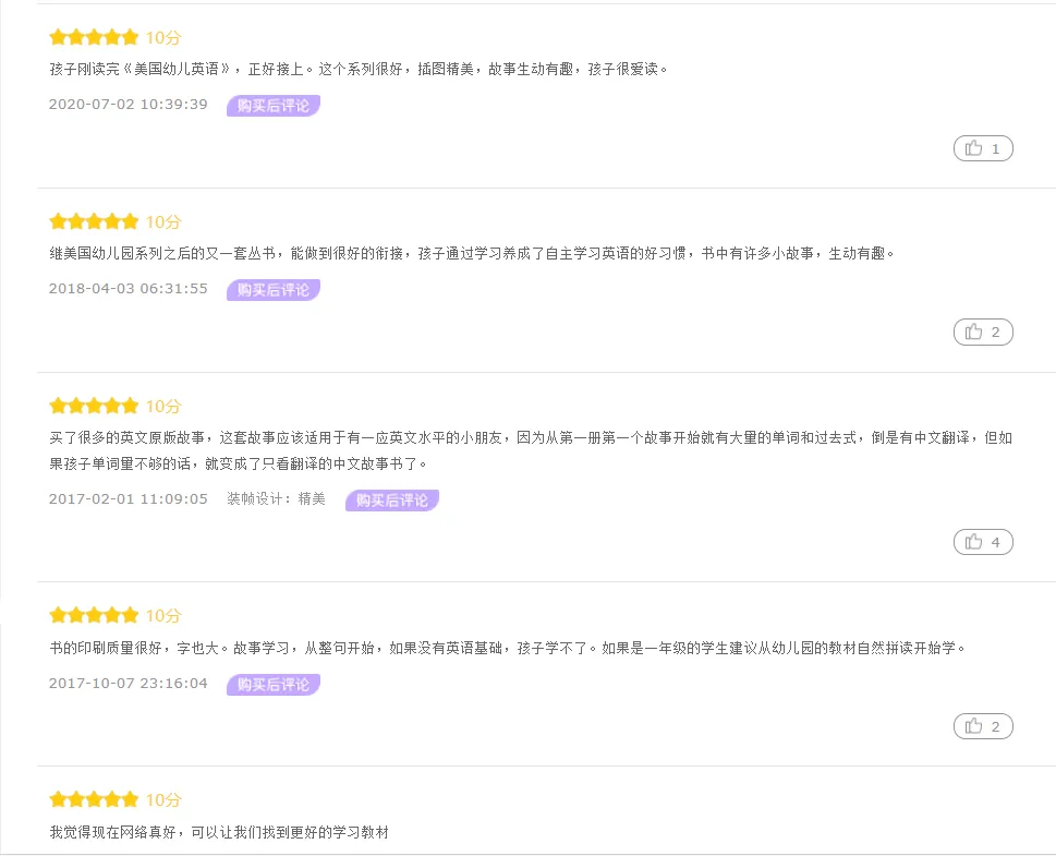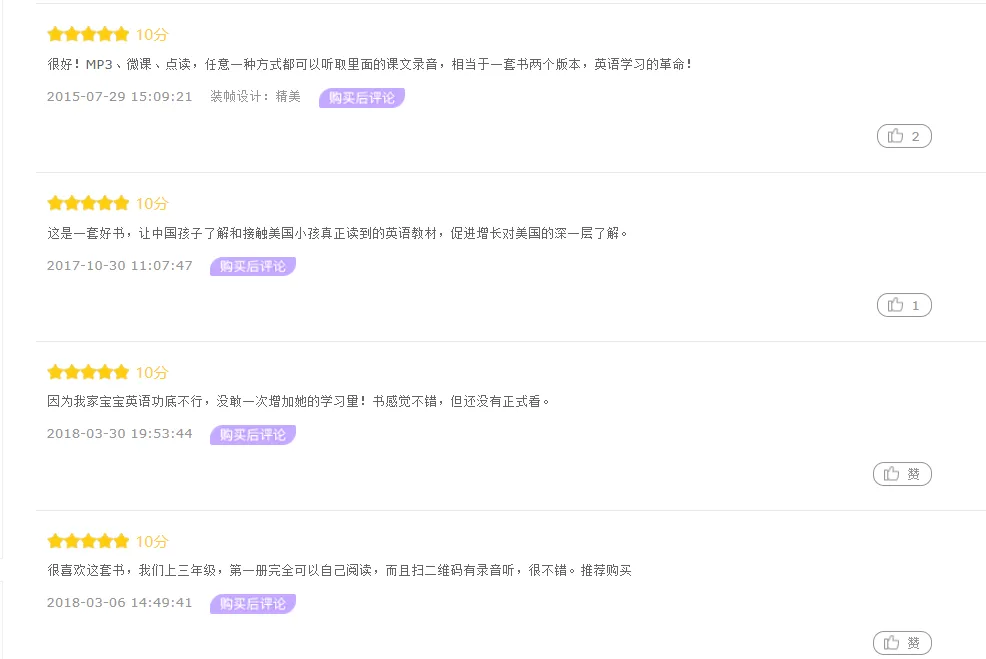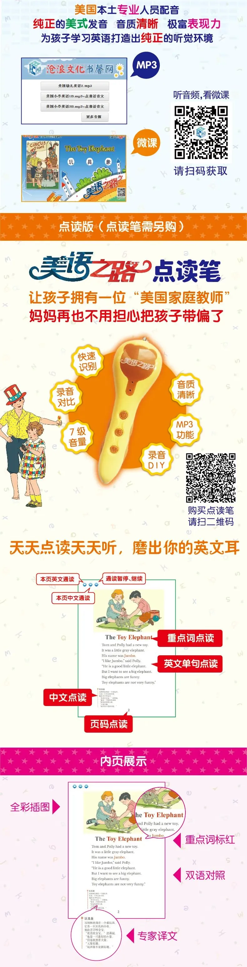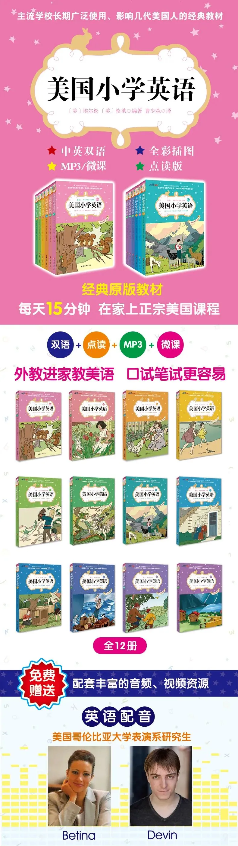 金杯、银杯不如大家的口碑,《美国小学英语》出版至今受到了众多家长的肯定和称赞,下面这些只是一部分,一起来感受一下。它们是20世纪上半叶美国最优秀的英语阅读教材,由美国教育界权威性人物,教育理论家和教育实践家主编,贯穿着美国人的思维方式,包含着浓浓的美国文化气息。引入本系列的初衷,是让国内的英语学习者,从一开始就接触正宗的美式英语,近距离接触美国原味文化,从“根语言”学起。这些图书在美国已经使用了近一个世纪,尤其是“婴儿潮”那代人,都是读着这些教材长大的。如今,那一代人已成为美国社会各个领域的中坚力量,从当今总统,到企业巨子和商业大亨,乃至科技、教育、文化、艺术等专业领域的权威名流,应有尽有。怎么样?正在为孩子选择英语书的你,是不是想更多了解一下呢?说起这套书也是大有来头,它是上世纪美国主流学校长期广泛使用,影响了几代美国人的经典教材!它曾在美国精英阶层广泛流行,陪伴了很多美国中产家庭度过了珍贵的童年时光。本套教材分6个年级,每年级 2册,共12册。它的魅力与《美国幼儿启蒙英语》是一脉相承的,前面介绍到的特色它基本都有,赠送:MP3、微课,为孩子打造纯美语语音环境。好多中国小朋友从这套书中受益匪浅,现在,他们都读得好棒呢!让我们一起来欣赏一下吧!感觉不错吧,现在跟我一起来了解一下其中一册的内容,你会爱上它的。从幼儿园到小学校,孩子们的活动空间大大地拓展了。因此,本级的多数故事都以动物为主人公,透过简短有趣的情节传递有用的知识,并巧妙地达到学习语言的目的。A册以一个英文句子为一行,B册逐渐出现了两三个句子组成的短小段落。简单的句型、数量不多的新词在精彩的故事中不断重复出现,非常易于掌握。美国哥伦比亚大学表演系研究生配音,纯正美语从听开始为本书配音的是美国哥伦比亚大学表演系研究生Betina和Devin,真正的世界名校高材生啊!他们纯正地道的美式发音,原汁原味,音质清晰优美,生动鲜活,极富表现力。他们用最正宗的美语为孩子打造出纯正的听觉环境,妈妈再也不用担心孩子的发音“跑偏”啦!这套书与一般引进书最大的区别是,它除了几十本纸质书还有——丰厚的附加值——强大的视听资源!几乎所有的视听形式都配备上了,真正用心良苦啊!沧浪文化书馨网可以免费下载mp3,看微课;微信公众号上免费在线听音频、看微课;让孩子在家也好,出门也罢;有网也好,无网也罢,都可以听英语磨耳朵!点上方小程序参与抢购