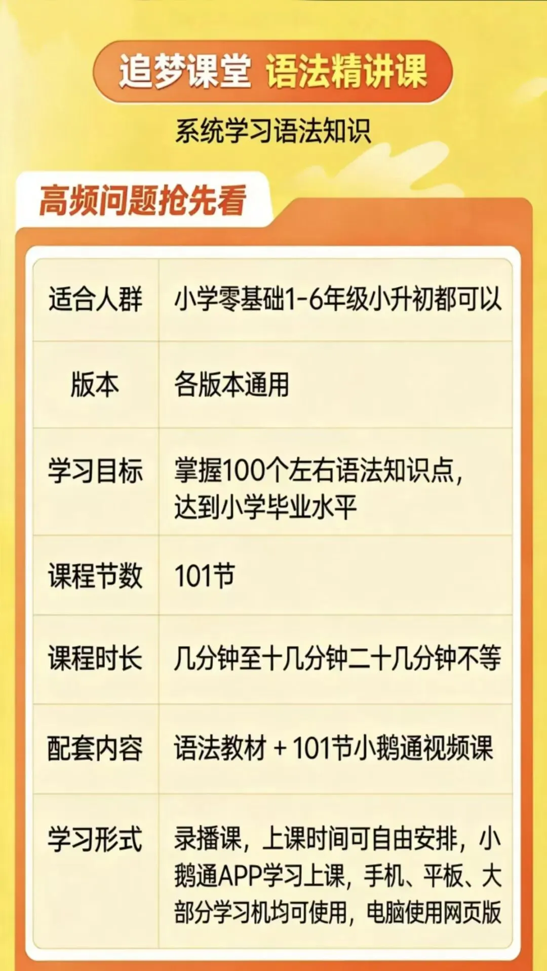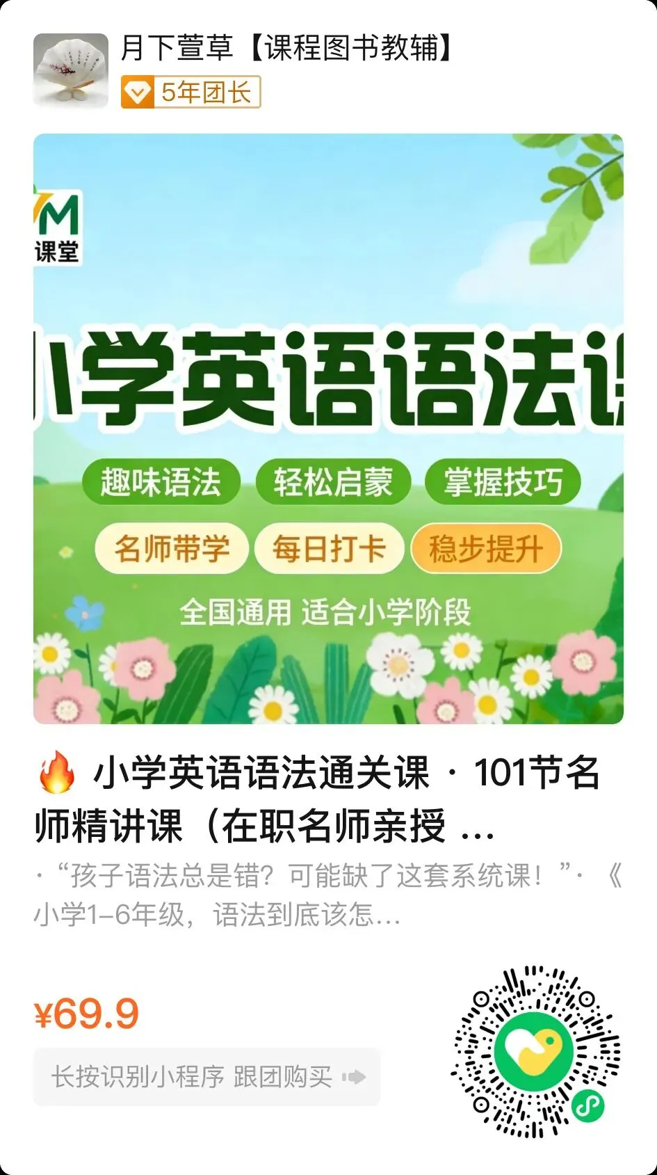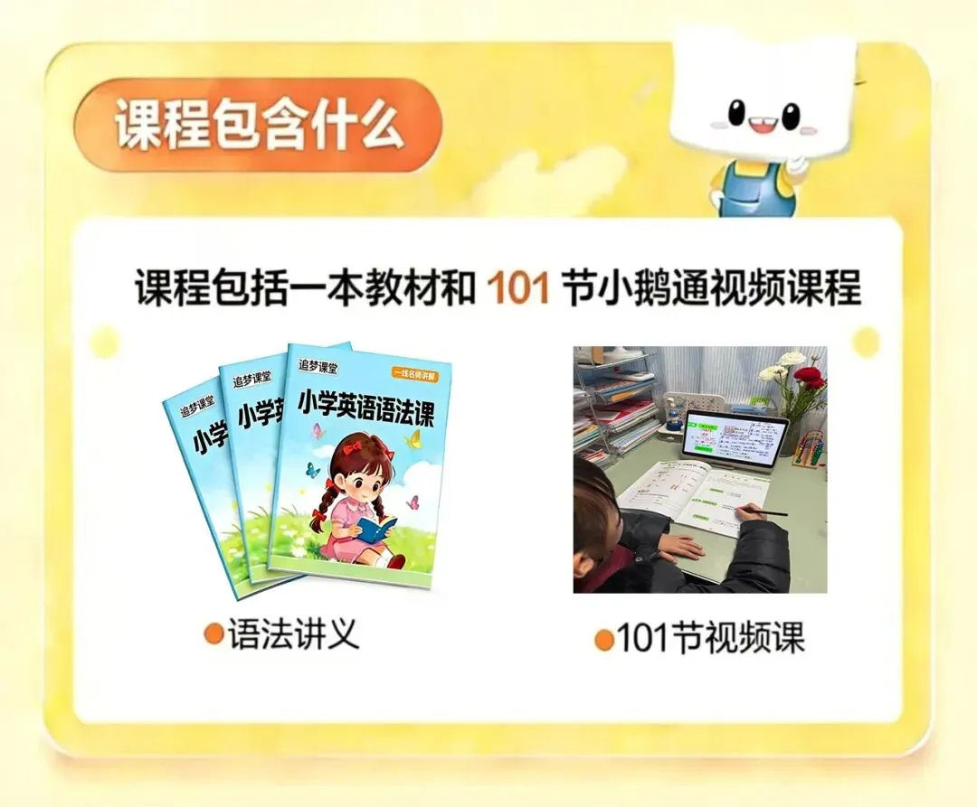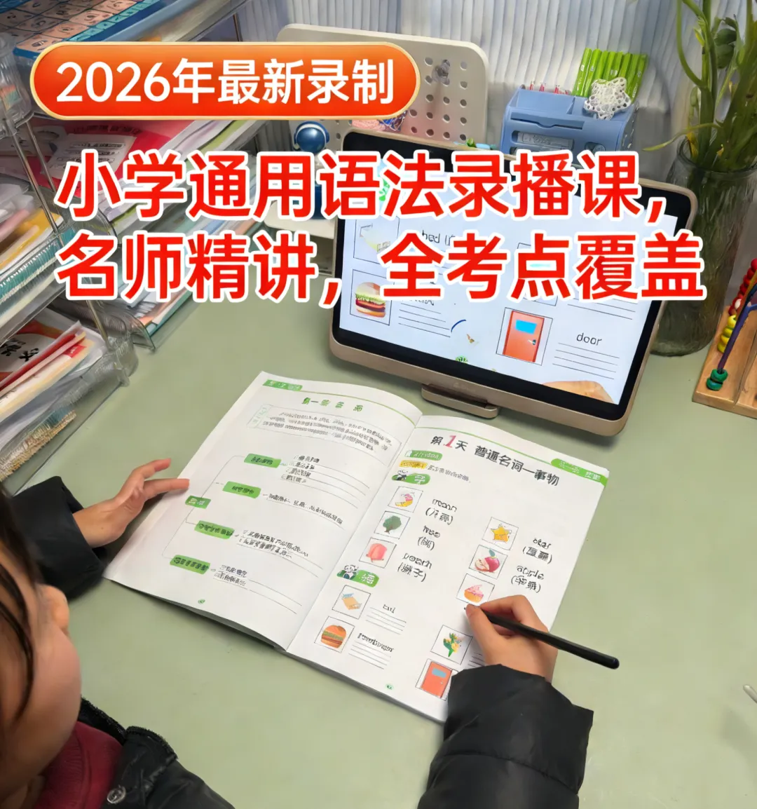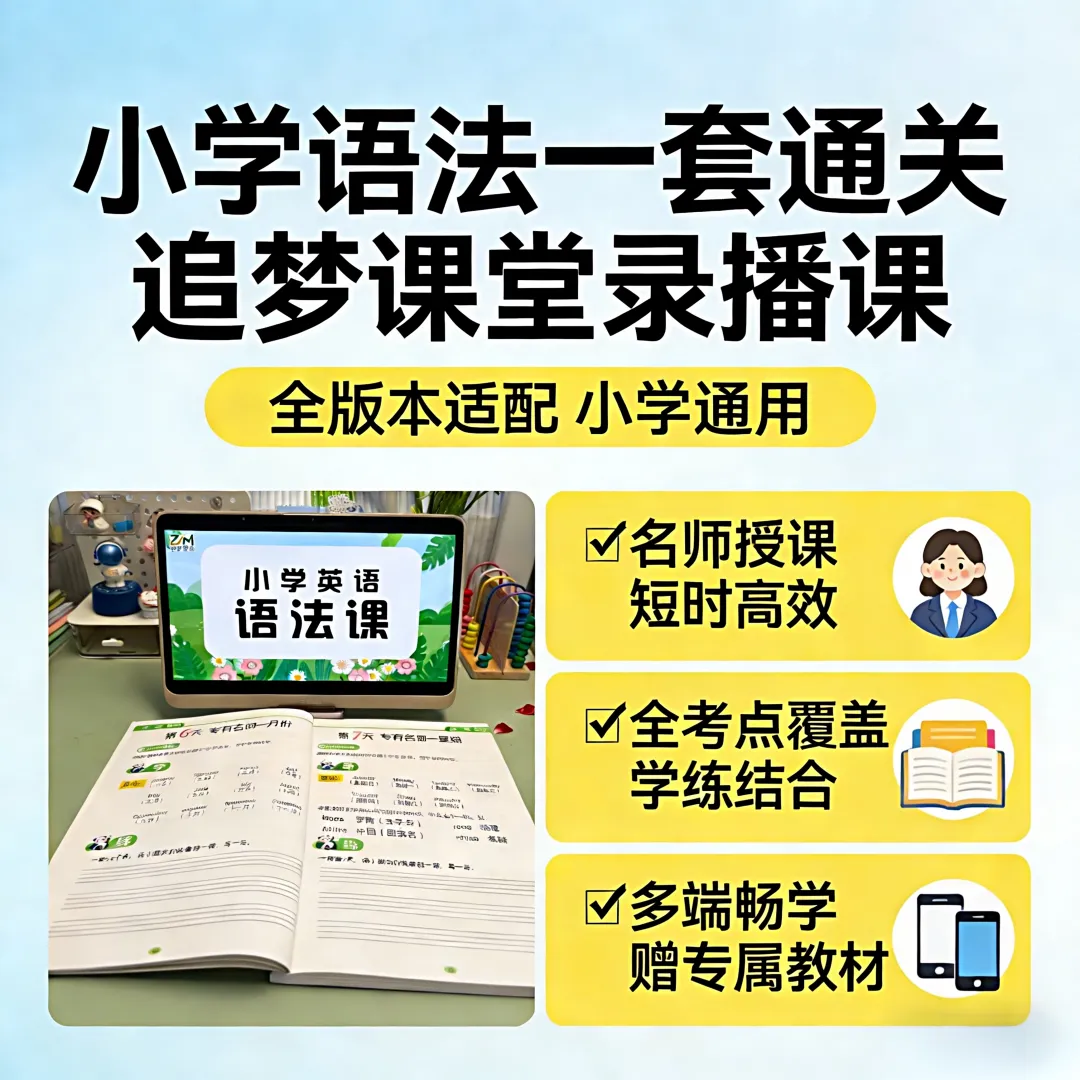 🔥 小学英语语法通关课 · 101节名师精讲课(在职名师亲授 ·+配套实体教材 )原价128元首发特价🉐69.9元✅ 名师精准教学:一线在职老师录制,紧扣校内考点与易错点,直击考试。✅ 体系完整高效:101节课系统覆盖小学1-6年级核心语法,一套课夯实基础,助力拔高。✅ 学练闭环扎实:每节课均匹配纸质教材习题,看完即练,巩固效果。✅ 录播课反复观看,永久有效,随时预习复习!