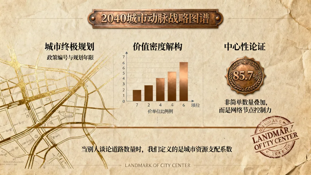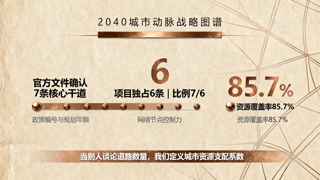 但明确写进城市规划的核心干道,就不一样了,未来建再多条,核心干道永远是核心干道。就如太子爷,永远是太子爷,除非皇帝改诏书,政府改规划。所以我们从“6”改为“7分之6”,看似只是加了一个分母,实则是完成了从“数量思维”到“比例思维”的更换。