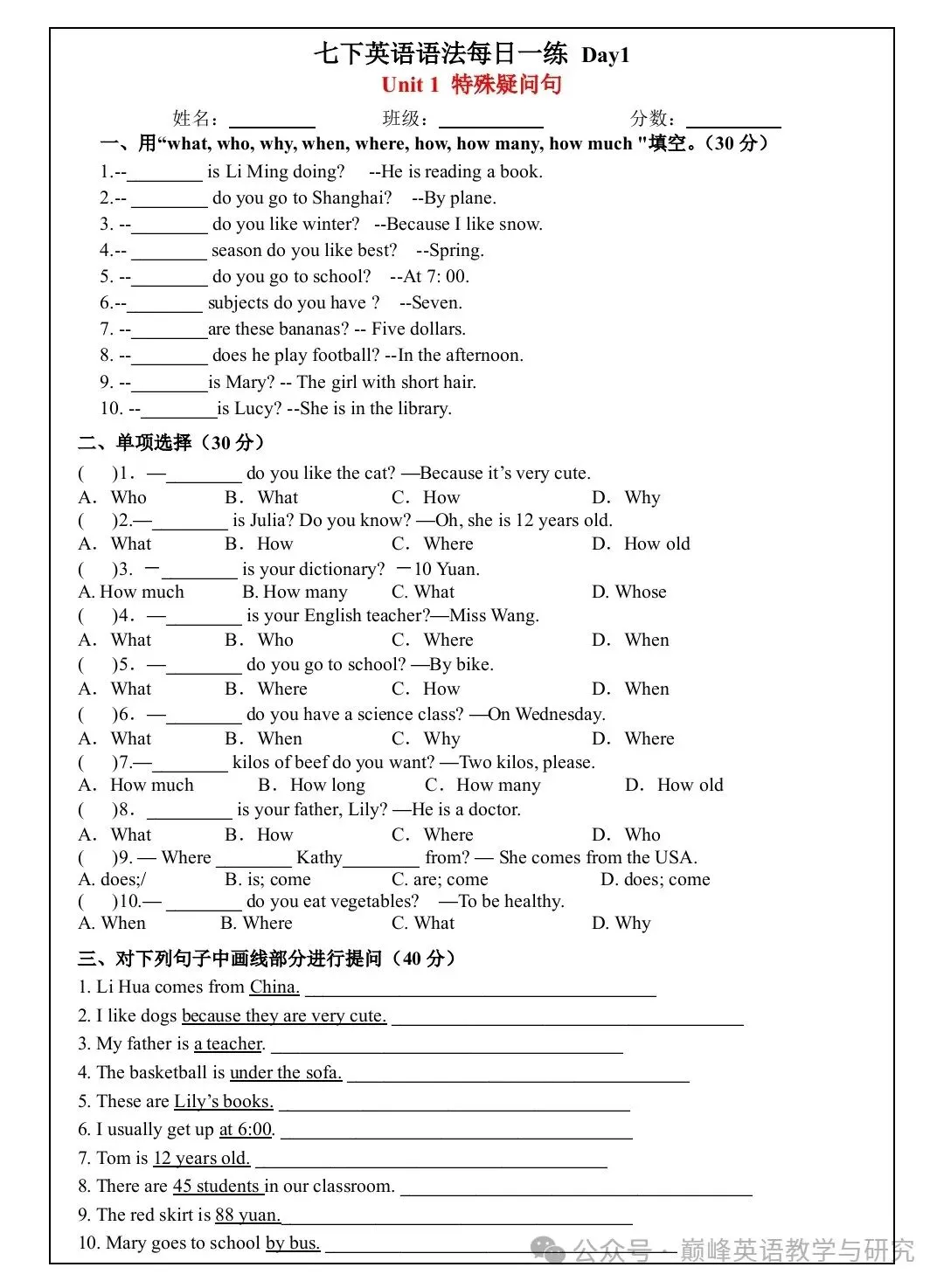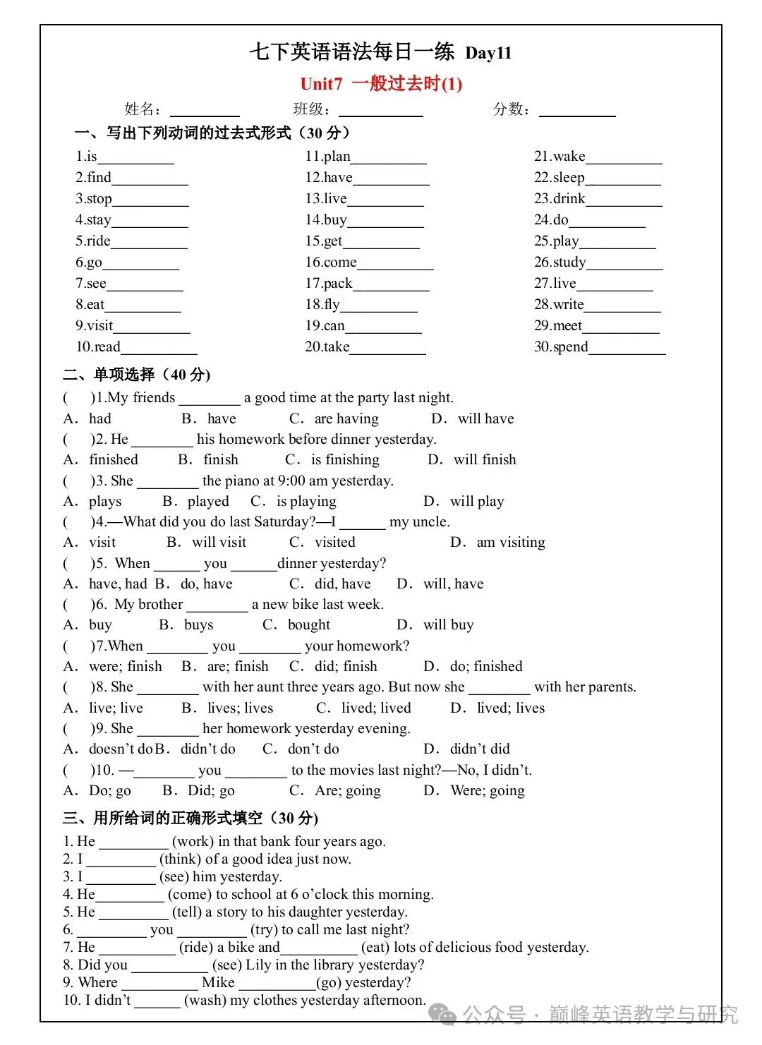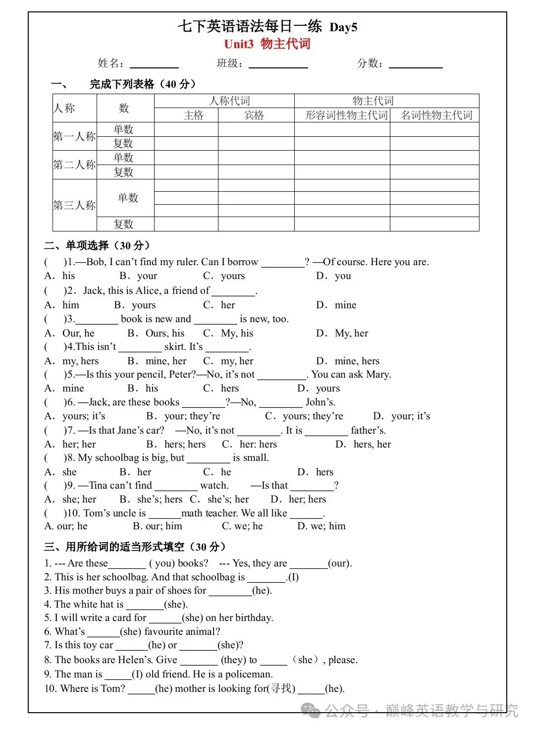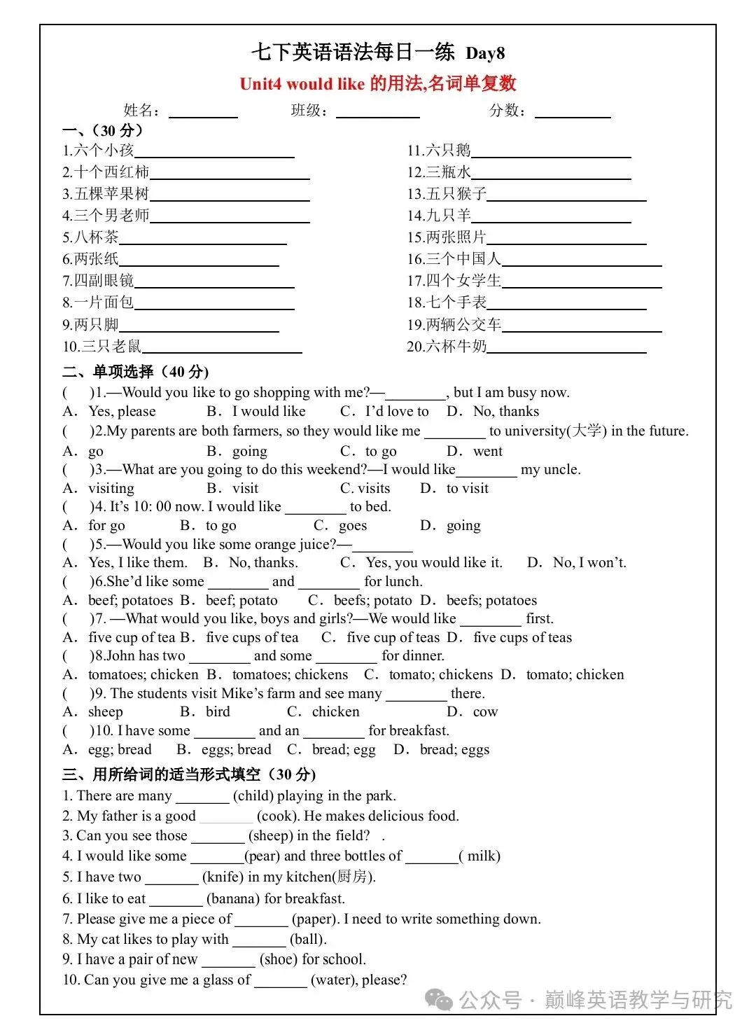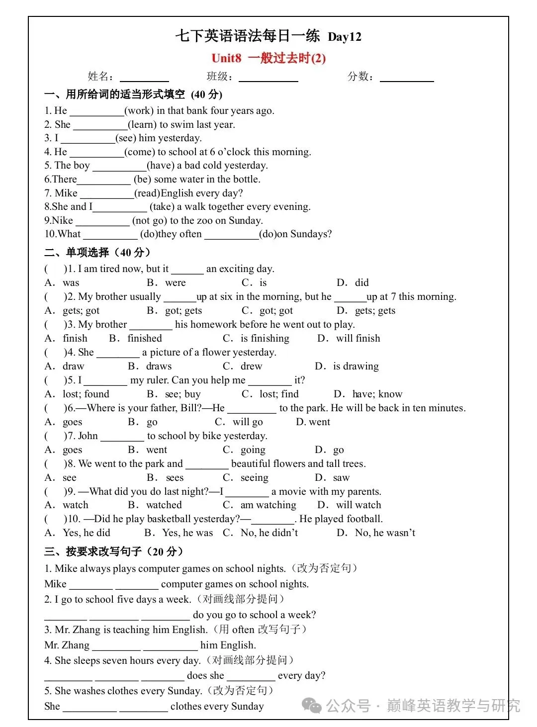 当前位置:首页>初中教材>【初中新教材】2024-2025学年人教版英语七年级下册语法每日一练(打印下载)