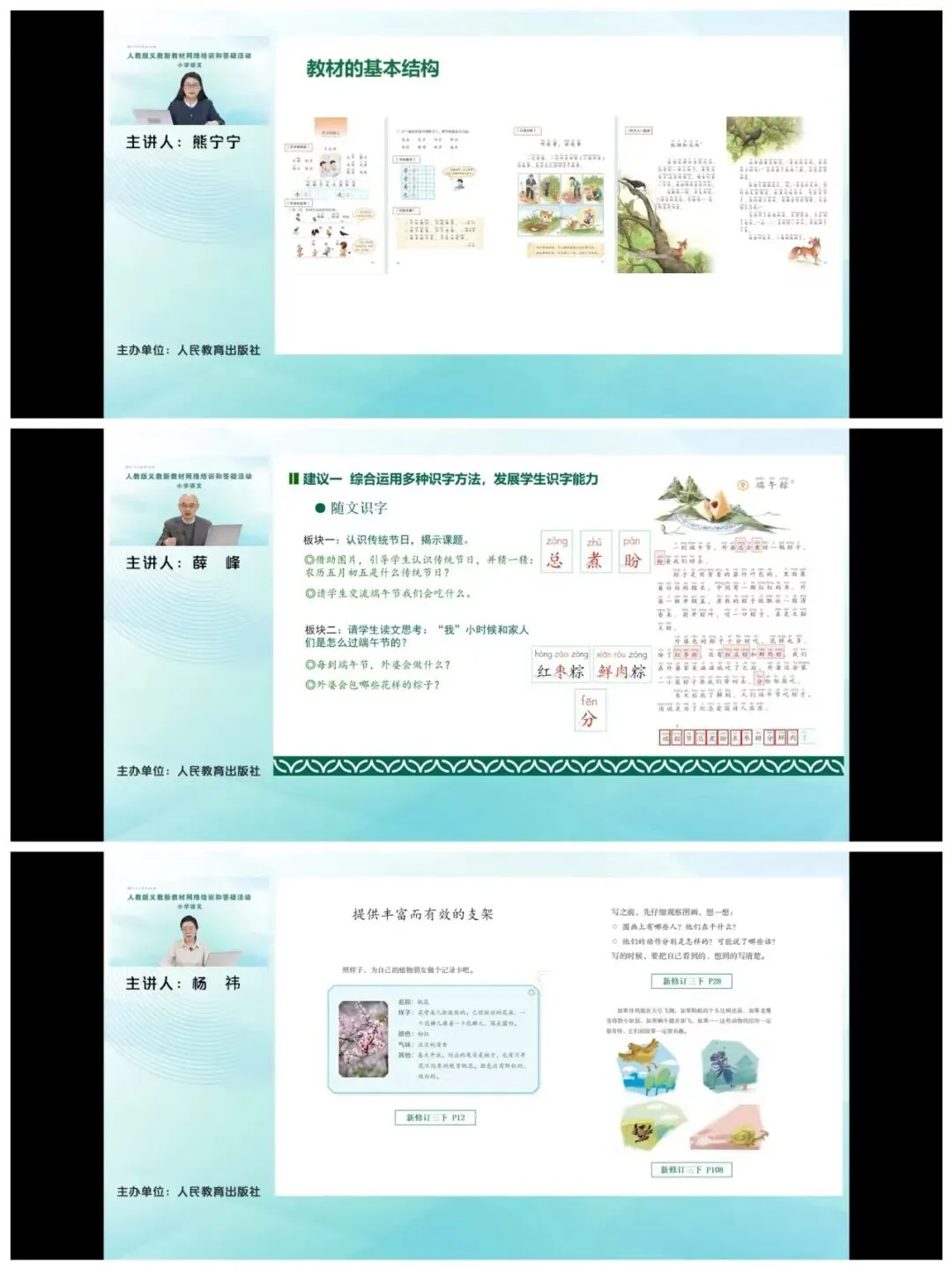 熊宁宁、林孝杰、杨祎教研员分别对一年级下册语文、二年级下册语文、三年级下册语文新修订的教材进行分析讲解,从教材的编写思路出发,系统梳理教材编排逻辑,阐明“人文主题”与“语文要素"双线组元的深刻内涵,帮助老师真正读懂教材,吃透教材。