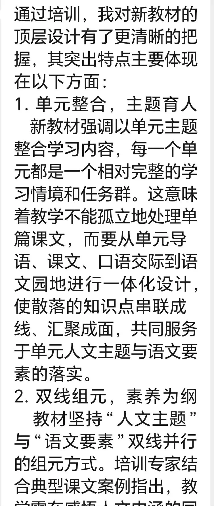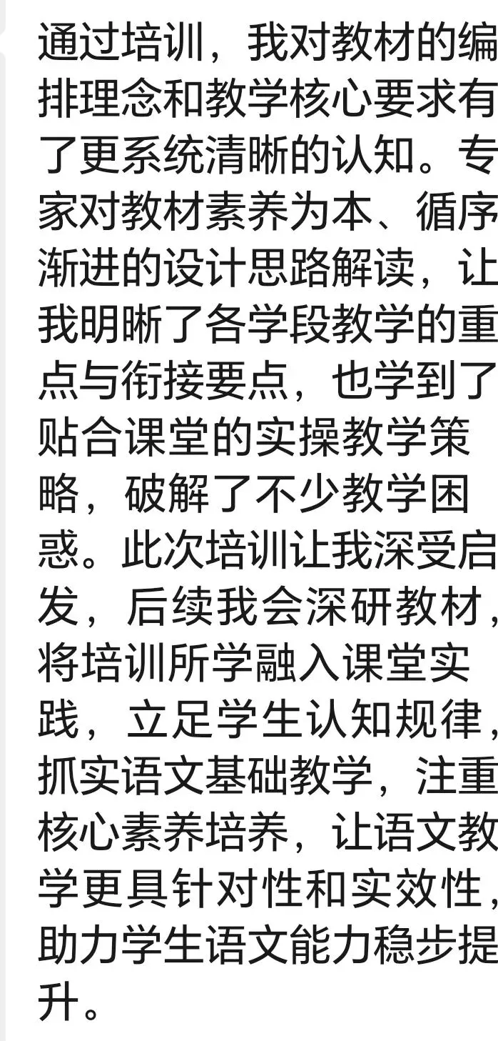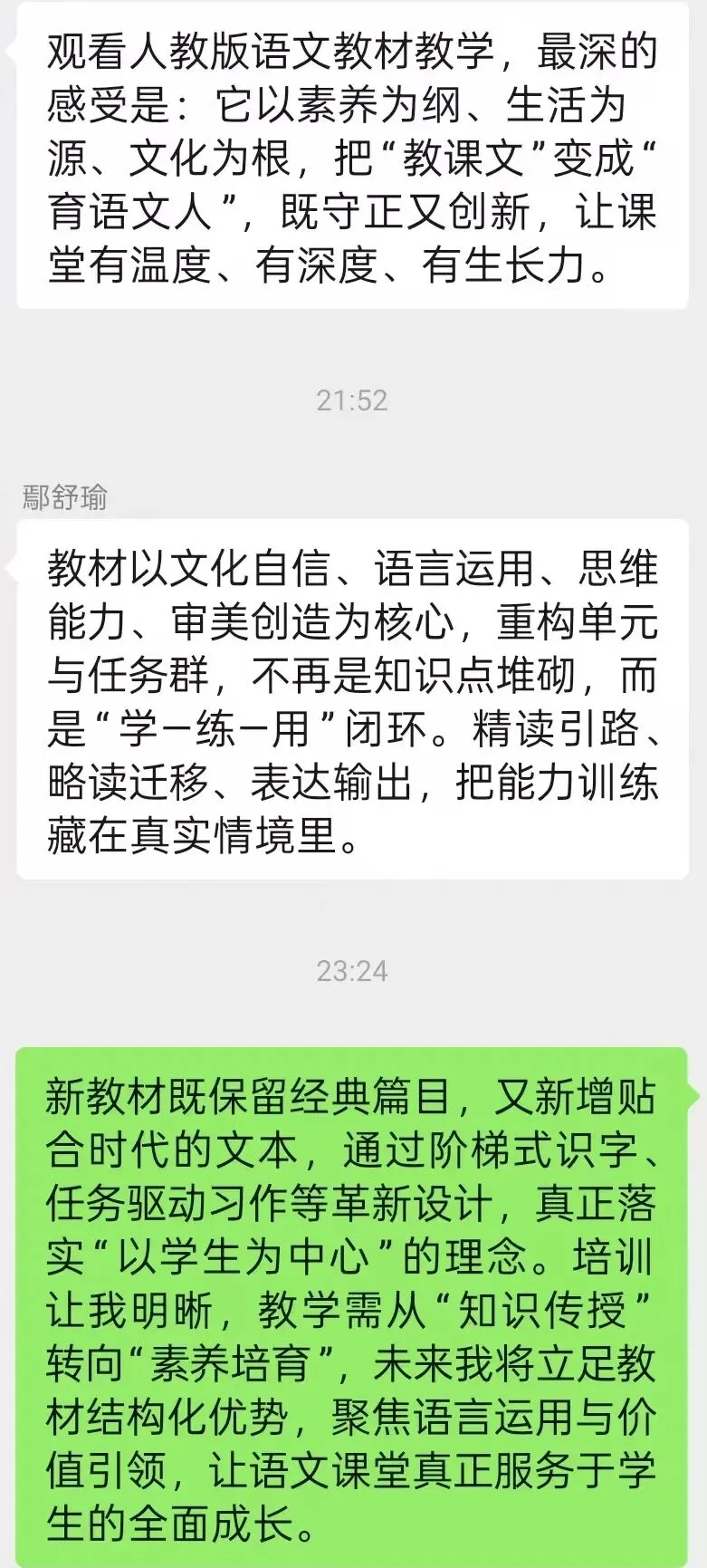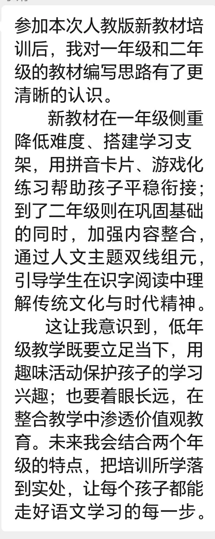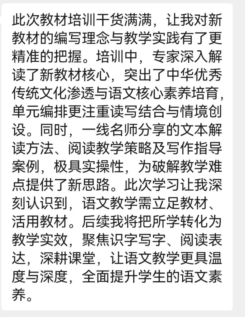新教材培训犹如一场及时雨,浇灌着教学创新的土壤。我们深刻体会到,唯有教师深入研读教材、把握育人方向,方能引领学生在语言文字的天地里,感受中华文化之美,积蓄面向未来的力量。我们都将成为新教材第一线的使用者,让我们凝心聚力新征程,教师赋能再出发,在思中悟,在悟中行,在变局中开新局,相信我们一定能在新教材中,解锁新风景,达成新成就!
