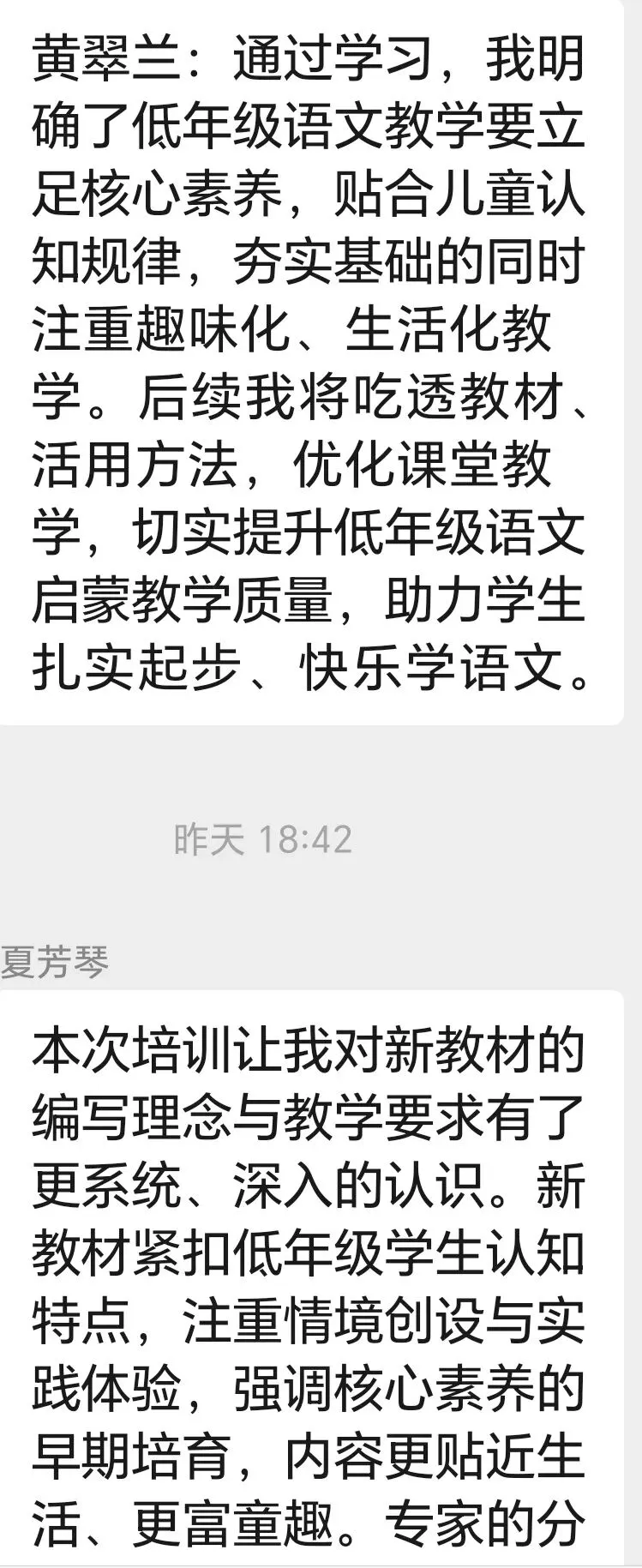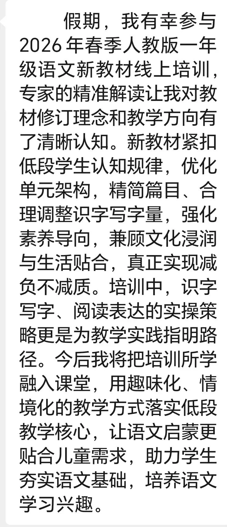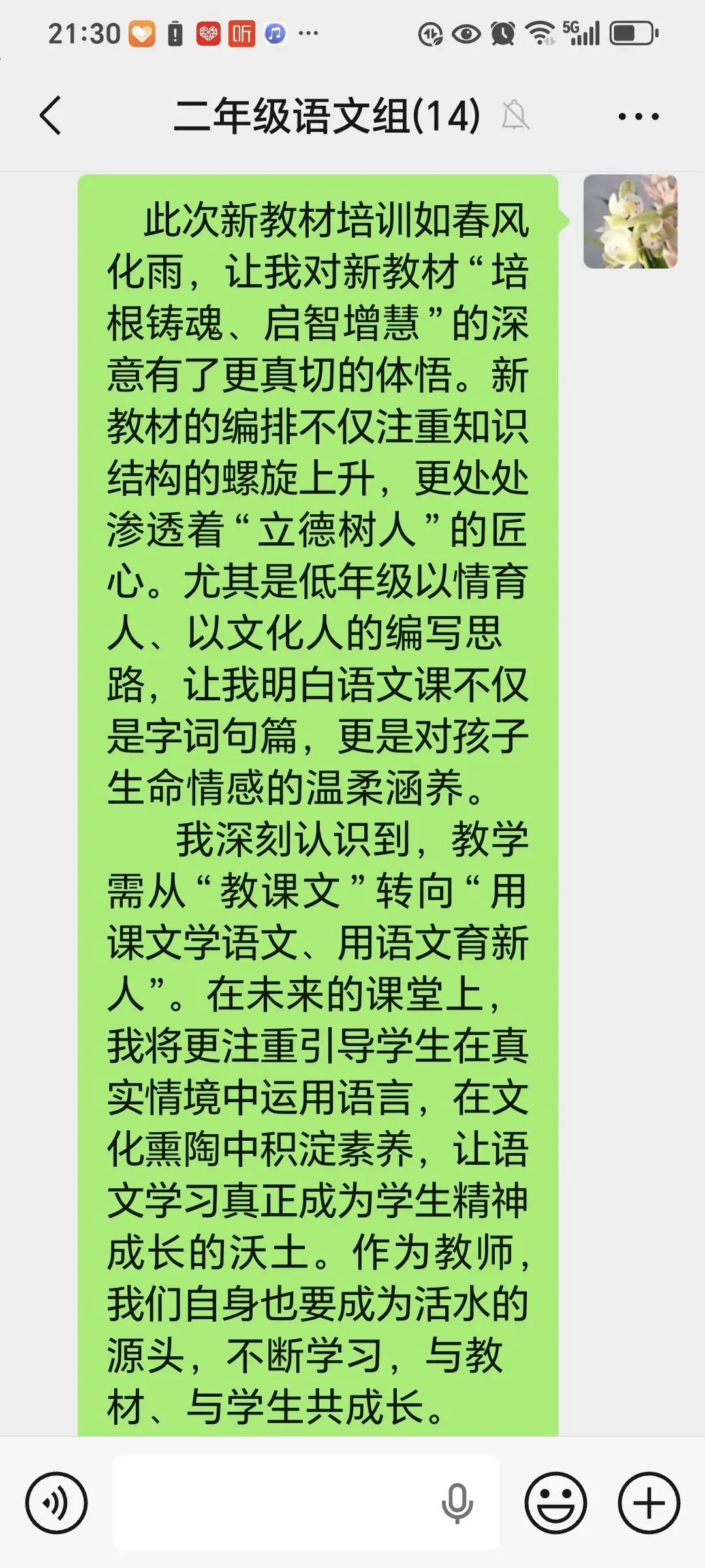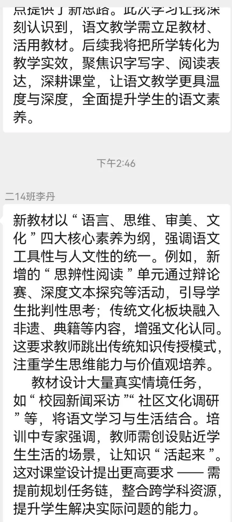新教材培训犹如一场及时雨,浇灌着教学创新的土壤。我们深刻体会到,唯有教师深入研读教材、把握育人方向,方能引领学生在语言文字的天地里,感受中华文化之美,积蓄面向未来的力量。我们都将成为新教材第一线的使用者,让我们凝心聚力新征程,教师赋能再出发,在思中悟,在悟中行,在变局中开新局,相信我们一定能在新教材中,解锁新风景,达成新成就!