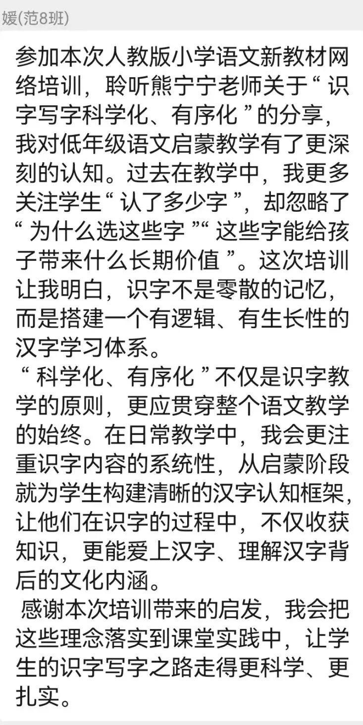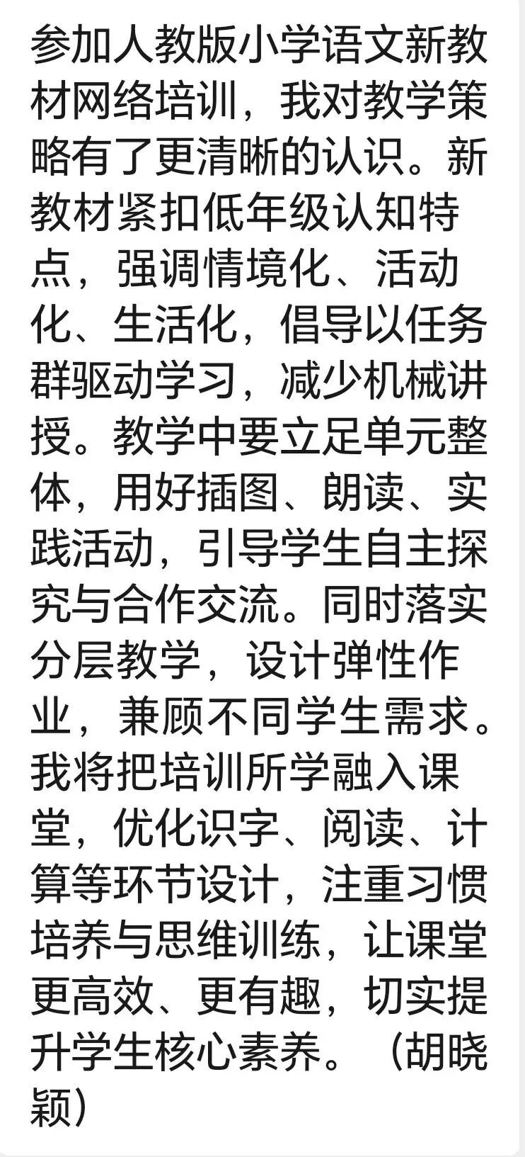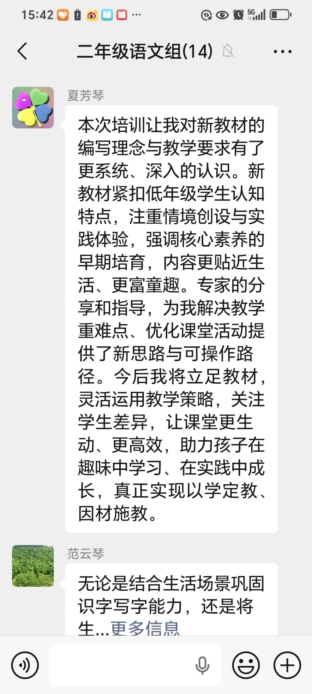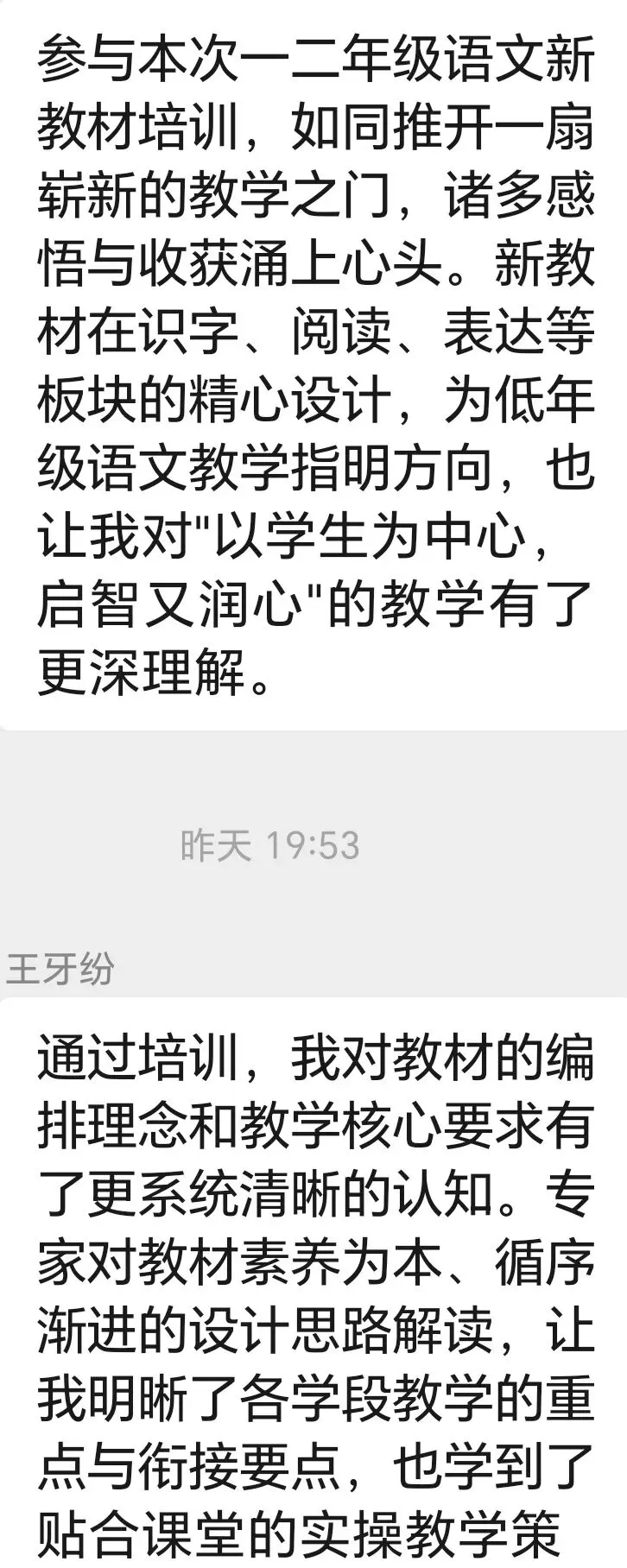 新教材培训犹如一场及时雨,浇灌着教学创新的土壤。我们深刻体会到,唯有教师深入研读教材、把握育人方向,方能引领学生在语言文字的天地里,感受中华文化之美,积蓄面向未来的力量。我们都将成为新教材第一线的使用者,让我们凝心聚力新征程,教师赋能再出发,在思中悟,在悟中行,在变局中开新局,相信我们一定能在新教材中,解锁新风景,达成新成就!
