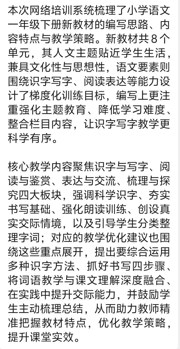 此次新教材编排体现了对学生认知发展规律的尊重和对教育目标的深刻理解。通过降低难度、调整顺序等方式,使教材内容更加贴近学生的实际水平,激发学生的学习兴趣和探索欲望。同时,注重知识的系统性和连贯性,为学生的长远发展奠定坚实基础。语文教师们认真聆听,详细记录,屏幕前专注的脸庞,评论区流淌的智慧、云端汇聚的热情,都将转化为教师们回归课堂后的实践与创造。