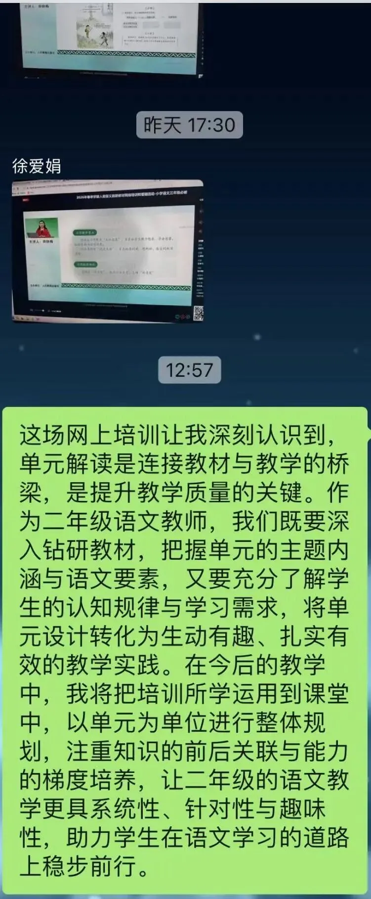 百年大计,教育为本;教育大计,教材为基。为深入贯彻党和国家关于教材建设管理的相关要求,落实《教育部教材局关于义务教育国家课程新修订教材使用有关事项的通知》要求,帮助广大教师准确理解和把握新教材内容,全面提升语文教师的教育教学能力,确保培训全覆盖目标落实到位,人民教育出版社于2026年2月4日开展人教版义务教育新教材网络培训和答疑活动,丰城市新城小学组织各年级语文教师共同参与了此次网上培训。