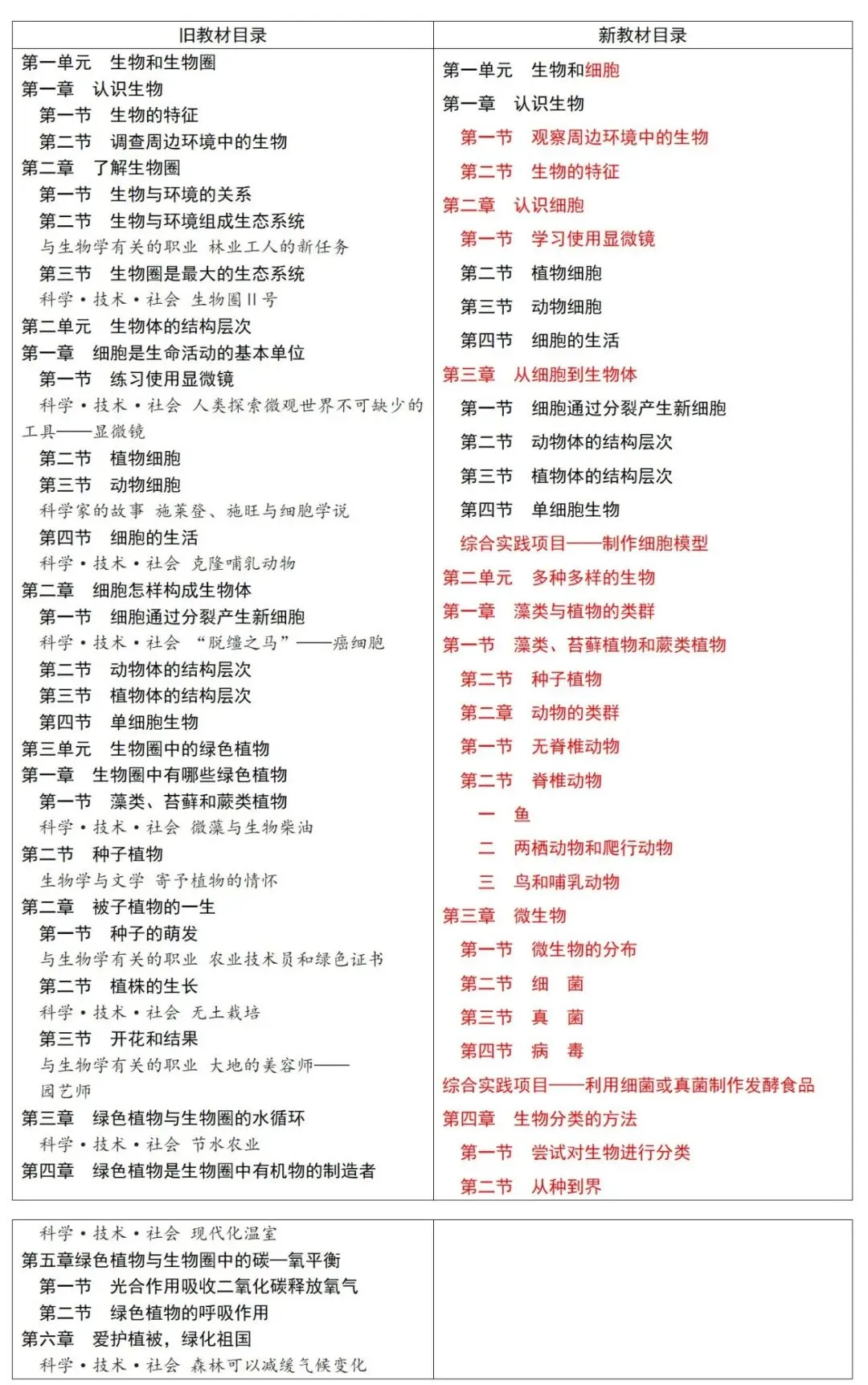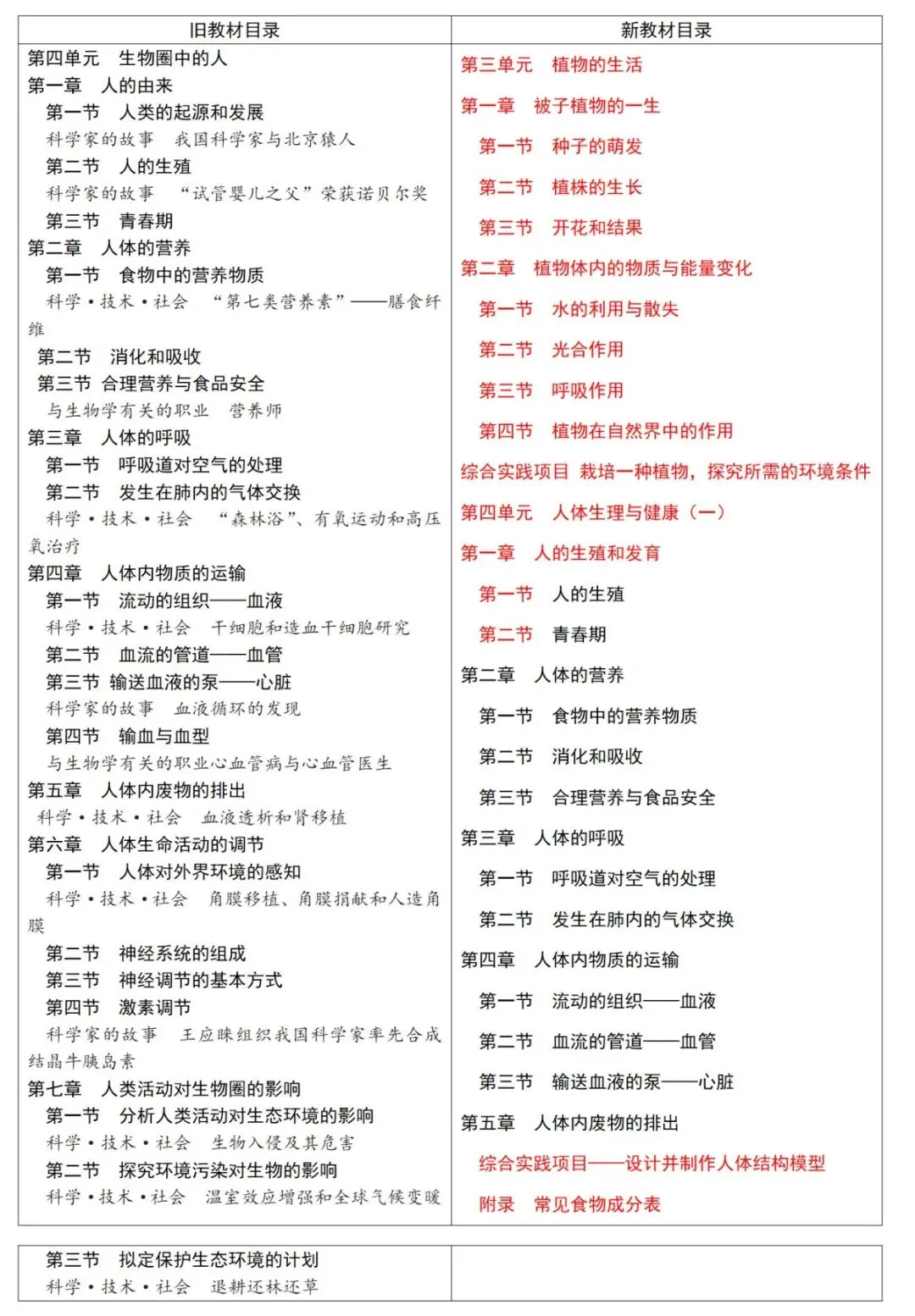 1.模块变更:由旧教材"生物圈中的人"变更为新教材"植物的生活"+"人体生理与健康(一)"。