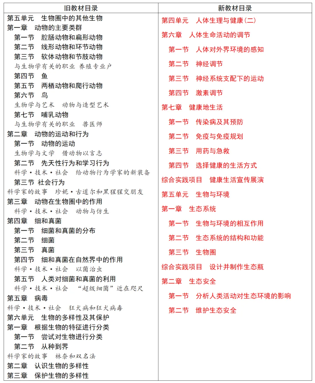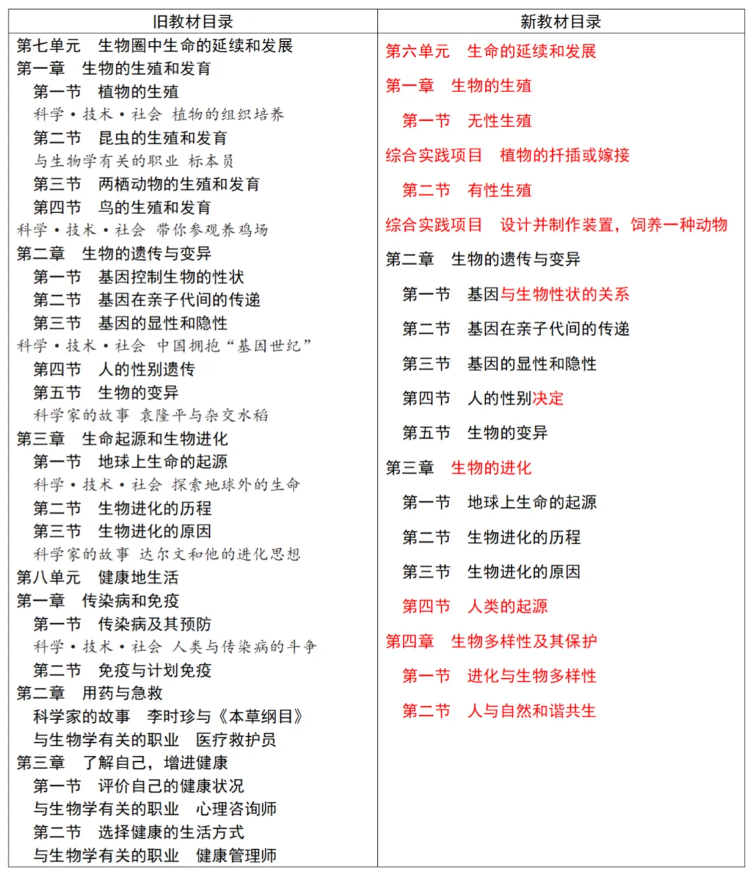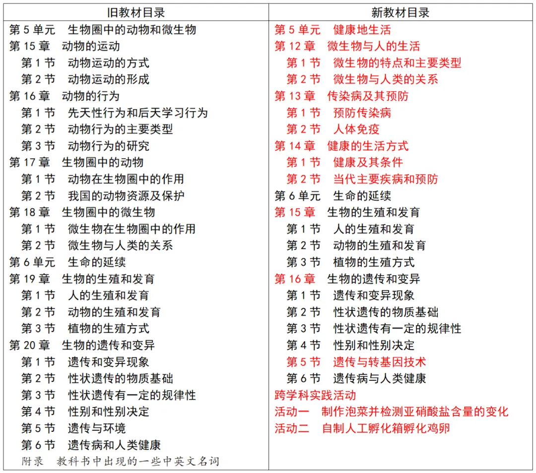 2.内容重组:“健康地生活”单元整合并新增了微生物、传染病与健康生活方式等内容;“生命的延续”单元“第5节 遗传与转基因技术” 整合了旧教材下册第25章第2节“现代生物技术”。
