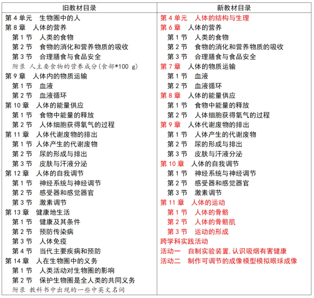1.模块变更:核心单元由旧教材“生物圈中的人”调整为“人体的结构与生理”,章节顺序重新整合,并将原八年级“动物运动的形成”相关内容并入,形成新章“人体的运动”。
