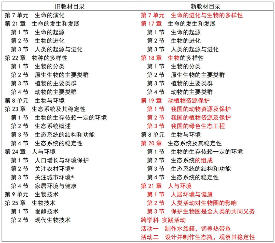 1.模块整合与新增:将旧教材“生命的演化”与“物种的多样性”整合为“生命的进化与生物的多样性”;新增独立的“动植物资源保护”章节。