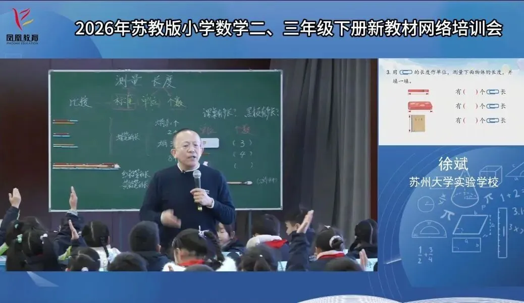 2月2日培训首日,课堂示范与教材解读同步推进。上午,特级教师徐斌带来观摩课《测量长度》,以趣味教学活动落实学生量感培养目标,生动践行新课标教学理念;苏教版教材分册主编刘娟娟副教授围绕二年级下册教材,从编排逻辑、知识体系到教学实施给出全面指导,为教师理清教学思路。