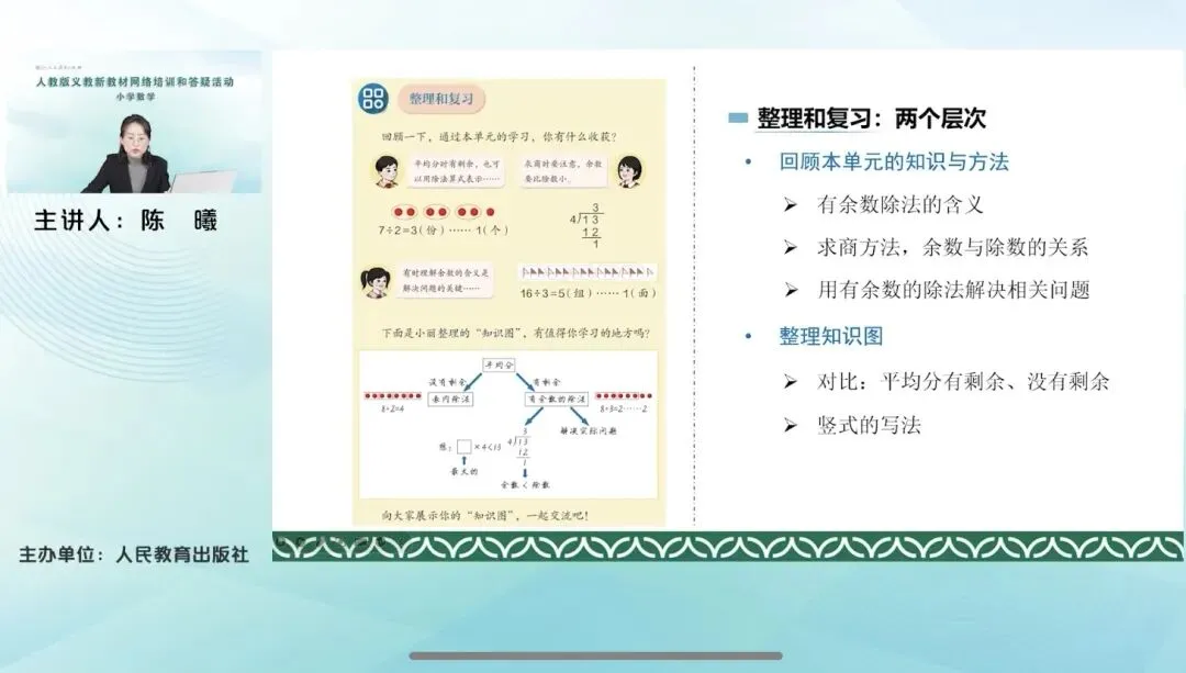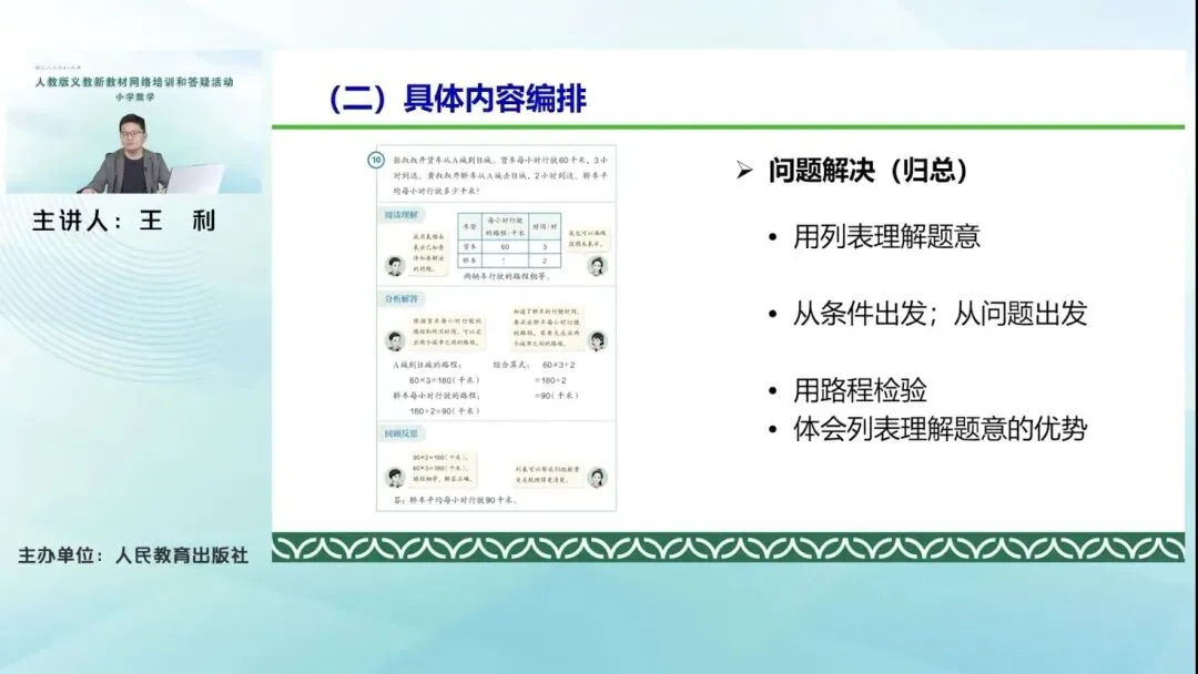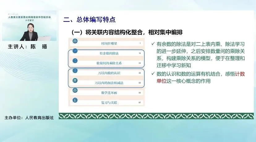 二年级下册教材进行了大幅的目录调整,删除表内除法、图形的运动等单元,新增《数量间的乘除关系》专门单元,完整呈现“倍”的三类数量模型,同时前移万以内数的认识与加减法,优化《有余数的除法》编排,新增除法竖式书写过程及余数意义的对比探究,配套《时间在哪里》《数学连环画》两个综合实践活动。教学中,我们要借助线段图帮助学生建立乘除法模型,用好几何直观和操作活动,引导学生自主探究余数与除数的关系。要注重从算术思维向模型思维过渡,渗透有序思考的方法,其核心理念是重视数量关系的总结与概括,通过结构化学习,培养学生的推理意识和应用能力。