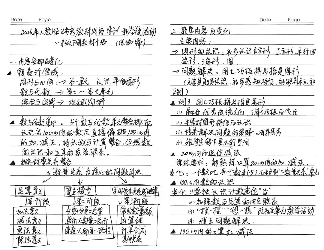 本次培训,聚焦人教版小学数学1-3年级新教材的整体变化。通过专家引领,我们对新教材的编写理念有了更清晰的认识,其核心变化可概括为三点: