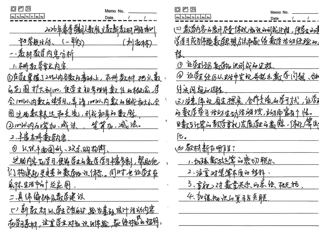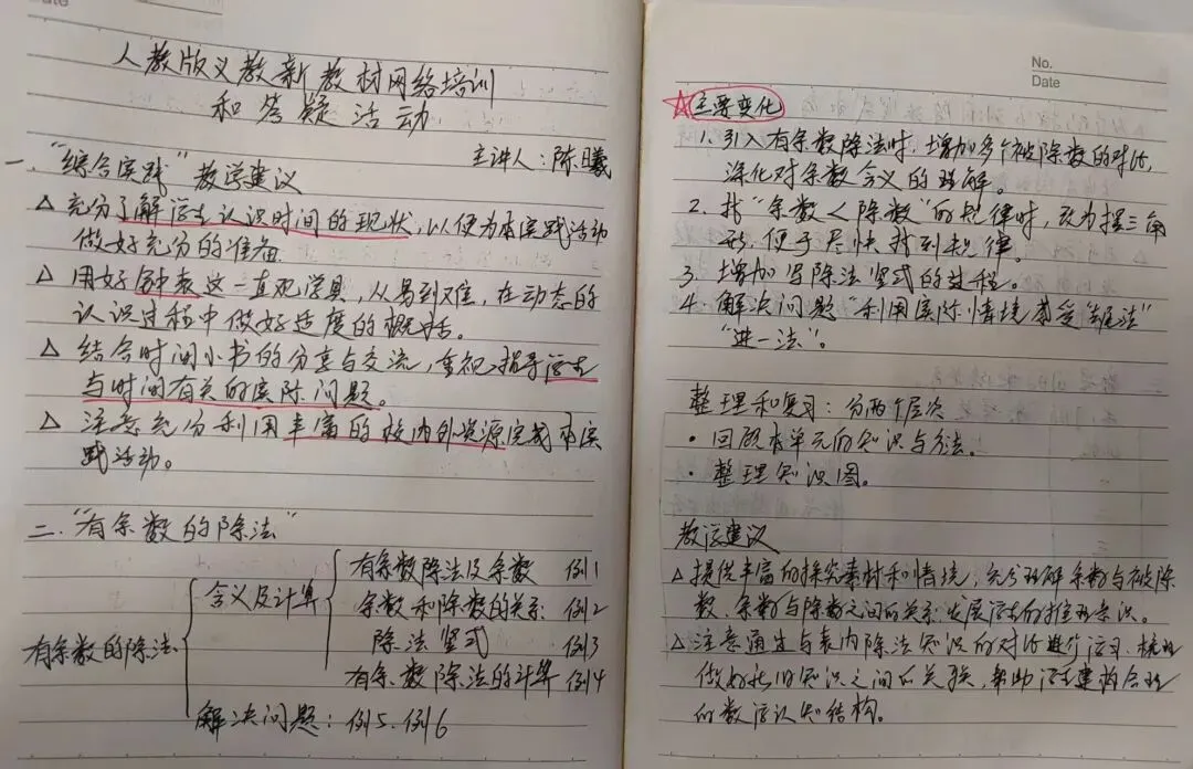 好记性不如烂笔头,深度学习的痕迹,藏在每一页认真的笔记里。培训过程中,工作室的老师们全神贯注,一边聆听专家解读,一边圈点勾画。从整体框架到细节变化,从核心素养到教学建议,都被一一记录。每一页笔记,都是对教材的深耕;每一行字迹,都是为课堂的蓄力。