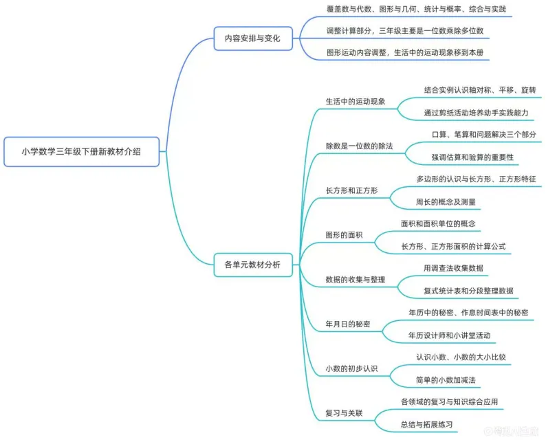 人教版小学数学三年级下册新教材的内容结构、主要变化及各单元教学要点,重点说明了数与代数(小数初步认识、一位数除法)、图形与几何(运动现象、长方形正方形、面积)、统计与概率(数据收集整理)、综合与实践(年月日秘密)四大领域的知识编排逻辑、核心概念设计意图与教学实施建议。
