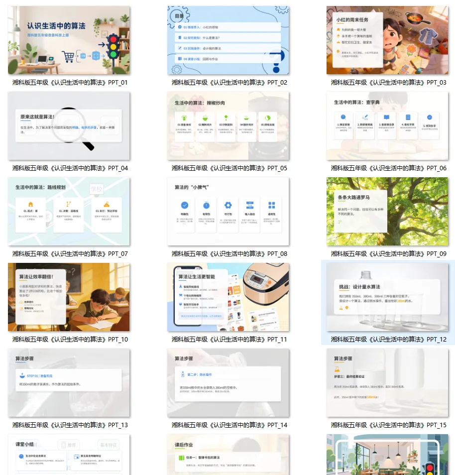 本活动是湘科版五年级信息科技上册第一单元的开篇内容,是学生接触算法知识的入门课。教材以生活场景为载体,从学生熟悉的家务劳动、菜肴制作、路线规划等实例切入,引导学生发现生活中的算法,理解算法的基本特征、多样性和价值,为后续学习算法的描述、设计与优化奠定基础。教材注重理论与实践结合,强调算法在生活中的应用,符合五年级学生具象思维向抽象思维过渡的认知特点。