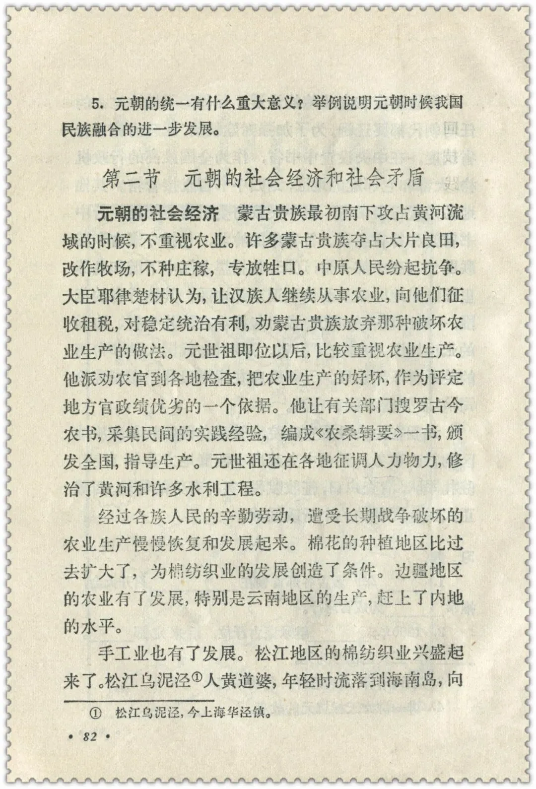 元朝的社会经济 蒙古贵族最初南下攻占黄河流域的时候,不重视农业。许多蒙古贵族夺占大片良田,改作牧场,不种庄稼,专放牲口。中原人民纷起抗争。大臣耶律楚材认为,让汉族人继续从事农业,向他们征收租税,对稳定统治有利,劝蒙古贵族放弃那种破坏农业生产的做法。元世祖即位以后,比较重视农业生产。他派劝农官到各地检查,把农业生产的好坏,作为评定地方官政绩优劣的一个依据。他让有关部门搜罗古今农书,采集民间的实践经验,编成《农桑辑要》一书,颁发全国,指导生产。元世祖还在各地征调人力物力,修治了黄河和许多水利工程。
