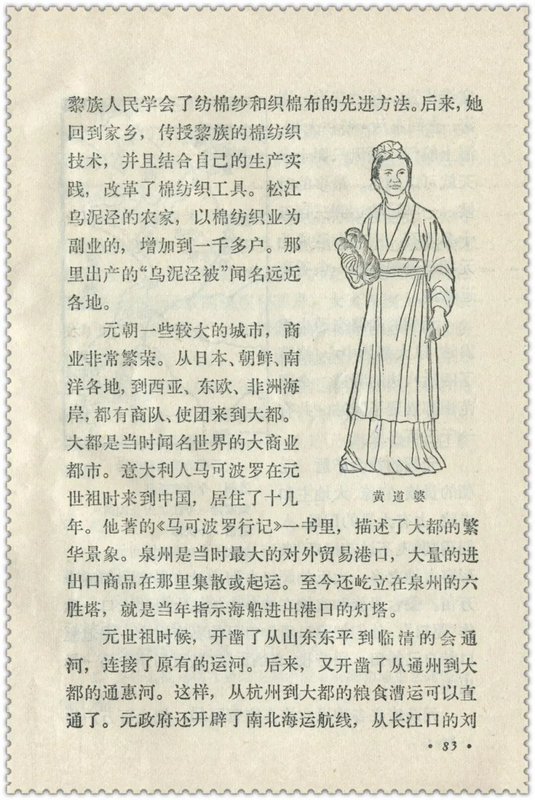 手工业也有了发展。松江地区的棉纺织业兴盛起来了。松江乌泥泾人黄道婆,年轻时流落到海南岛,向黎族人民学会了纺棉纱和织棉布的先进方法。后来,她回到家乡,传授黎族的棉纺织技术,并且结合自己的生产实践,改革了棉纺织工具。松江鸟泥泾的农家,以棉纺织业为副业的,增加到一千多户。那里出产的"乌泥泾被"闻名远近各地。