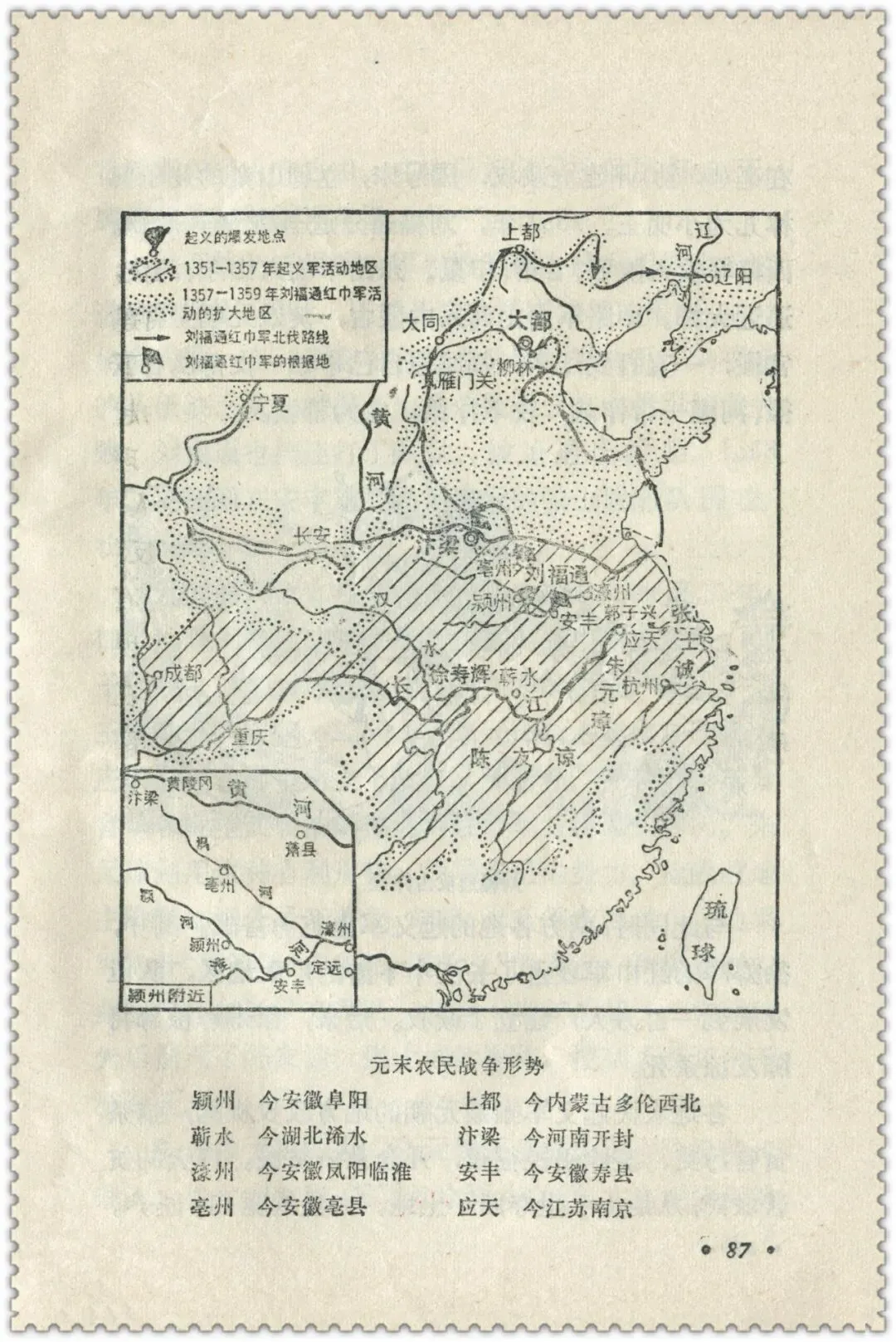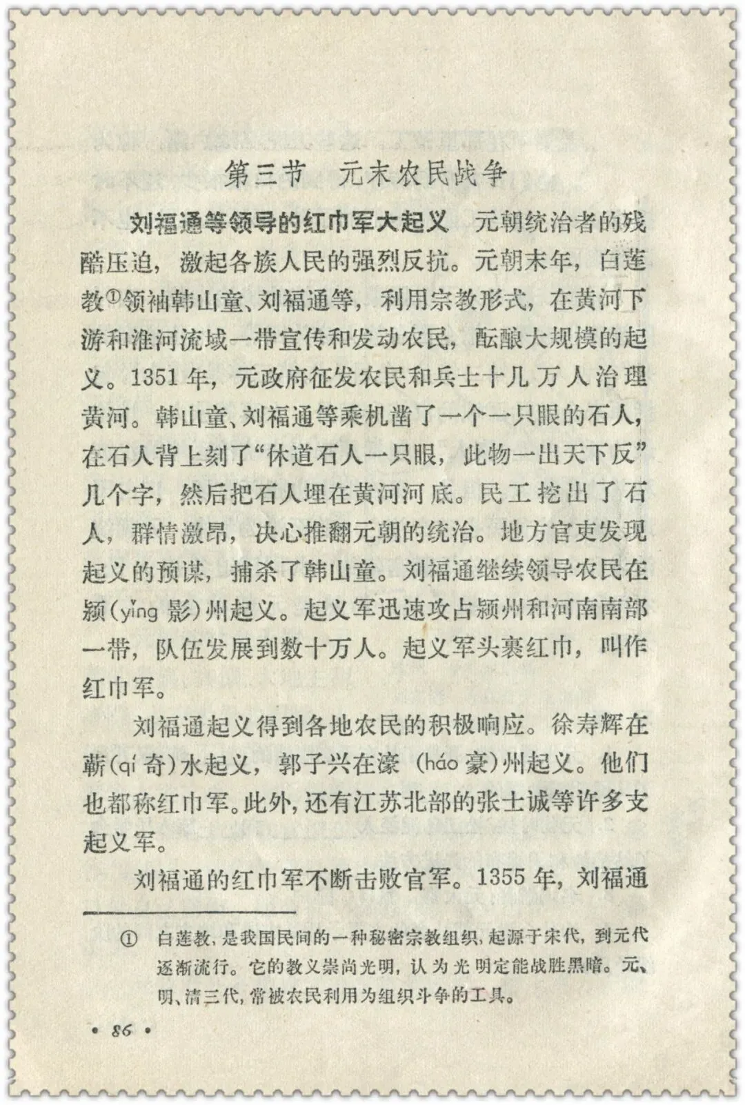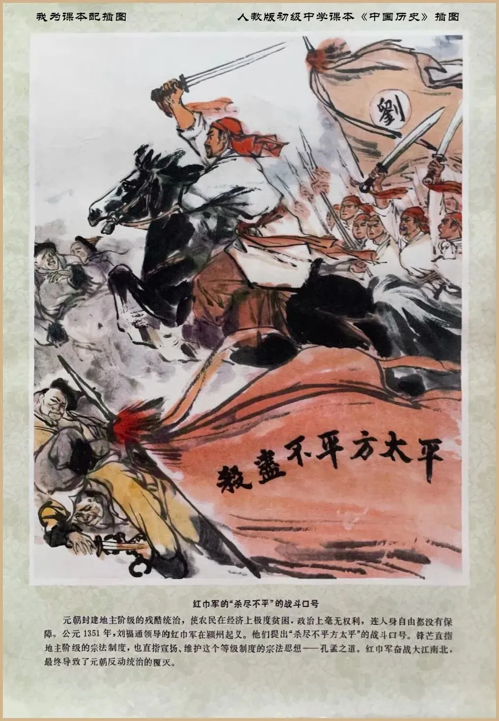 刘福通等领导的红巾军大起义 元朝统治者的残酷压迫,激起各族人民的强烈反抗。元朝末年,白莲教领袖韩山童,刘福通等,利用宗教形式,在黄河下游和淮河流域一带宣传和发动农民,酝酿大规模的起义。1351年,元政府征发农民和兵士十几万人治理黄河。韩山童,刘福通等乘机凿了一个一只眼的石人,在石人背上刻了"休道石人一只眼,此物一出天下反"几个字,然后把石人埋在黄河河底。民工挖出了石人,群情激昂,决心推翻元朝的统治。地方官吏发现起义的预谋,捕杀了韩山童。刘福通继续领导农民在颍州起义。起义军迅速攻占颍州和河南南部一带,队伍发展到数十万人。起义军头裹红巾,叫作红巾军。