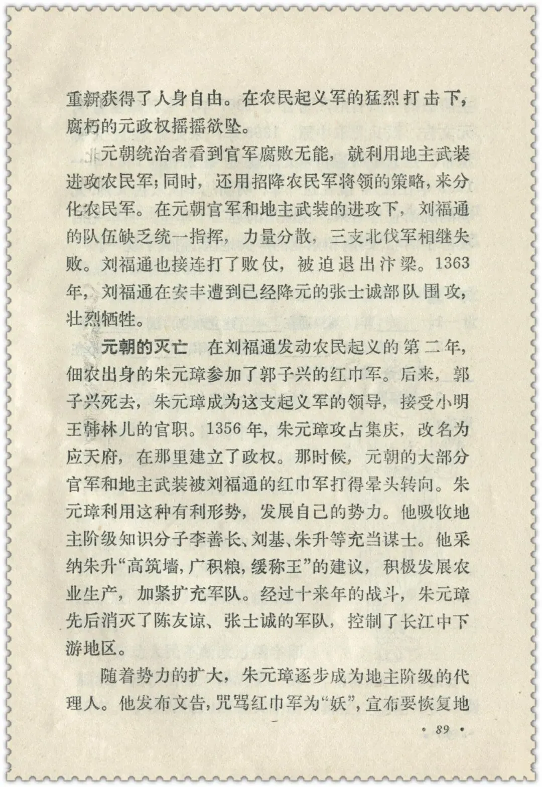 元朝的灭亡 在刘福通发动农民起义的第二年,佃农出身的朱元璋参加了郭子兴的红巾军。后来,郭子兴死去,朱元璋成为这支起义军的领导,接受小明王韩林儿的官职。1356年,朱元璋攻占集庆,改名为应天府,在那里建立了政权。那时候,元朝的大部分官军和地主武装被刘福通的红巾军打得晕头转向。朱元璋利用这种有利形势,发展自己的势力。他吸收地主阶级知识分子李善长,刘基,朱升等充当谋士。他采纳朱升"高筑墙,广积粮,缓称王"的建议,积极发展农业生产,加紧扩充军队。经过十来年的战斗,朱元璋先后消灭了陈友谅,张士诚的军队,控制了长江中下游地区。