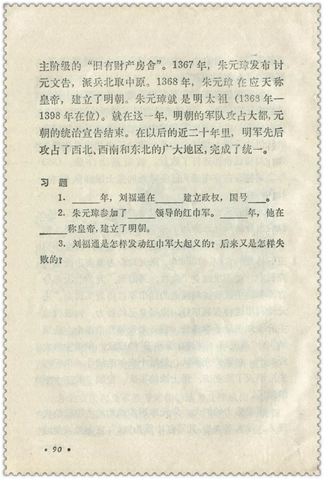 随着势力的扩大,朱元璋逐步成为地主阶级的代理人。他发布文告,咒骂红巾军为"妖",宜布要恢复地主阶级的"旧有财产房舍"。1367年,朱元璋发布讨元文告,派兵北取中原。1368年,朱元璋在应天称皇帝,建立了明朝。朱元璋就是明太祖(1368年一1398年在位)。就在这一年,明朝的军队攻占大都,元朝的统治宣告结束。在以后的近二十年里,明军先后攻占了西北,西南和东北的广大地区,完成了统一。