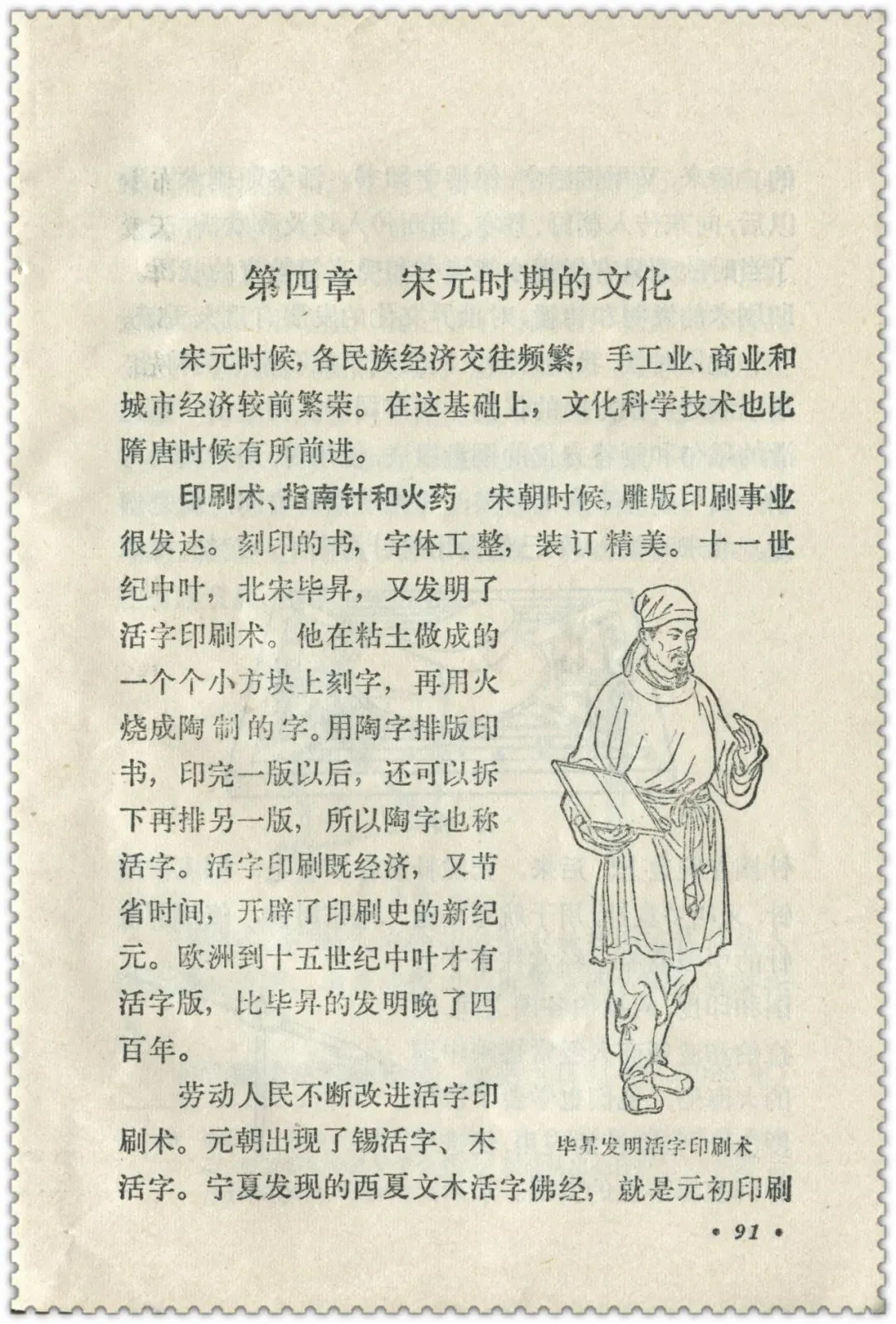 印刷术、指南针和火药 宋朝时候,雕版印刷事业很发达。刻印的书,字体工整,装订精美。十一世纪中叶,北宋毕昇,又发明了活字印刷术。他在粘土做成的一个个小方块上刻字,再用火烧成陶制的字。用陶字排版印书,印完一版以后,还可以拆下再排另一版,所以陶字也称活字。活字印刷既经济,又节省时间,开辟了印刷史的新纪元。欧洲到十五世纪中叶才有活字版,比毕界的发明晚了四百年。