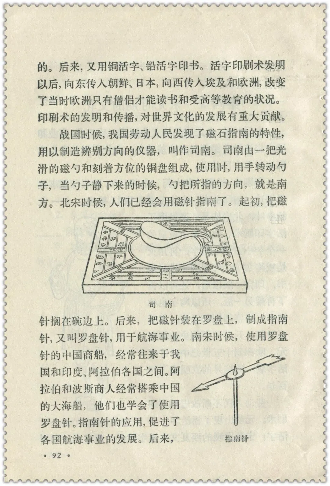 战国时候,我国劳动人民发现了磁石指南的特性,用以制造辨别方向的仪器,叫作司南。司南由一把光滑的磁勺和刻着方位的铜盘组成,使用时,用手转动勺子,当勺子静下来的时候,勺把所指的方向,就是南方。北宋时候,人们已经会用磁针指南了。起初,把磁针搁在碗边上。后来,把磁针装在罗盘上,制成指南针,又叫罗盘针,用于航海事业。南宋时候,使用罗盘针的中国商船,经常往来于我国和印度,阿拉伯各国之间。阿拉伯和波斯商人经常搭乘中国的大海船,他们也学会了使用罗盘针。指南针的应用,促进了各国航海事业的发展。后来,欧洲的航海家能够发现美洲和实现环球航行,指南针的发明和传播是一个重要的条件。
