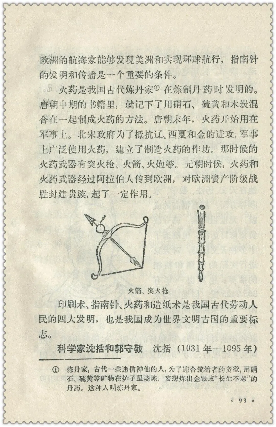 火药是我国古代炼丹家在炼制丹药时发明的。唐朝中期的书籍里,就记下了用硝石,硫黄和木炭混合在一起制成火药的方法。唐朝末年,火药开始用在军事上。北宋政府为了抵抗辽,西夏和金的进攻,军事上广泛使用火药,建立了制造火药的作坊。那时候的火药武器有突火枪,火箭,火炮等。元朝时候,火药和火药武器经过阿拉伯人传到欧洲,对欧洲资产阶级战胜封建贵族,起了一定作用。