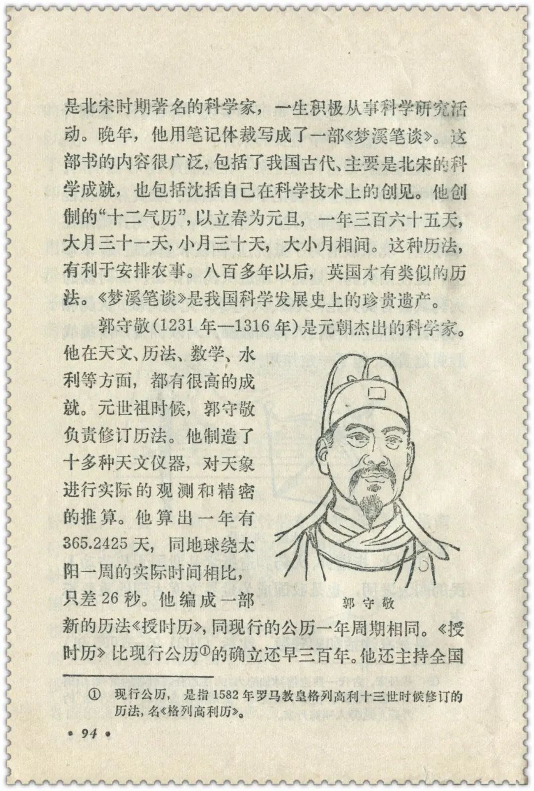 科学家沈括和郭守敬 沈括(1031年—1095年)是北宋时期著名的科学家,一生积极从事科学研究活动。晚年,他用笔记体裁写成了一部《梦溪笔谈》。这部书的内容很广泛,包括了我国古代,主要是北宋的科学成就,也包括沈括自己在科学技术上的创见。他创制的"十二气历",以立春为元旦,一年三百六十五天,大月三十一天,小月三十天,大小月相间。这种历法,有利于安排农事。八百多年以后,英国才有类似的历法。《梦溪笔谈》是我国科学发展史上的珍贵遗产。