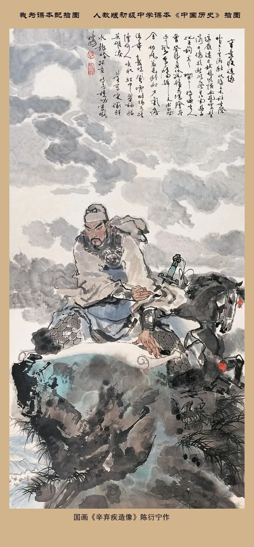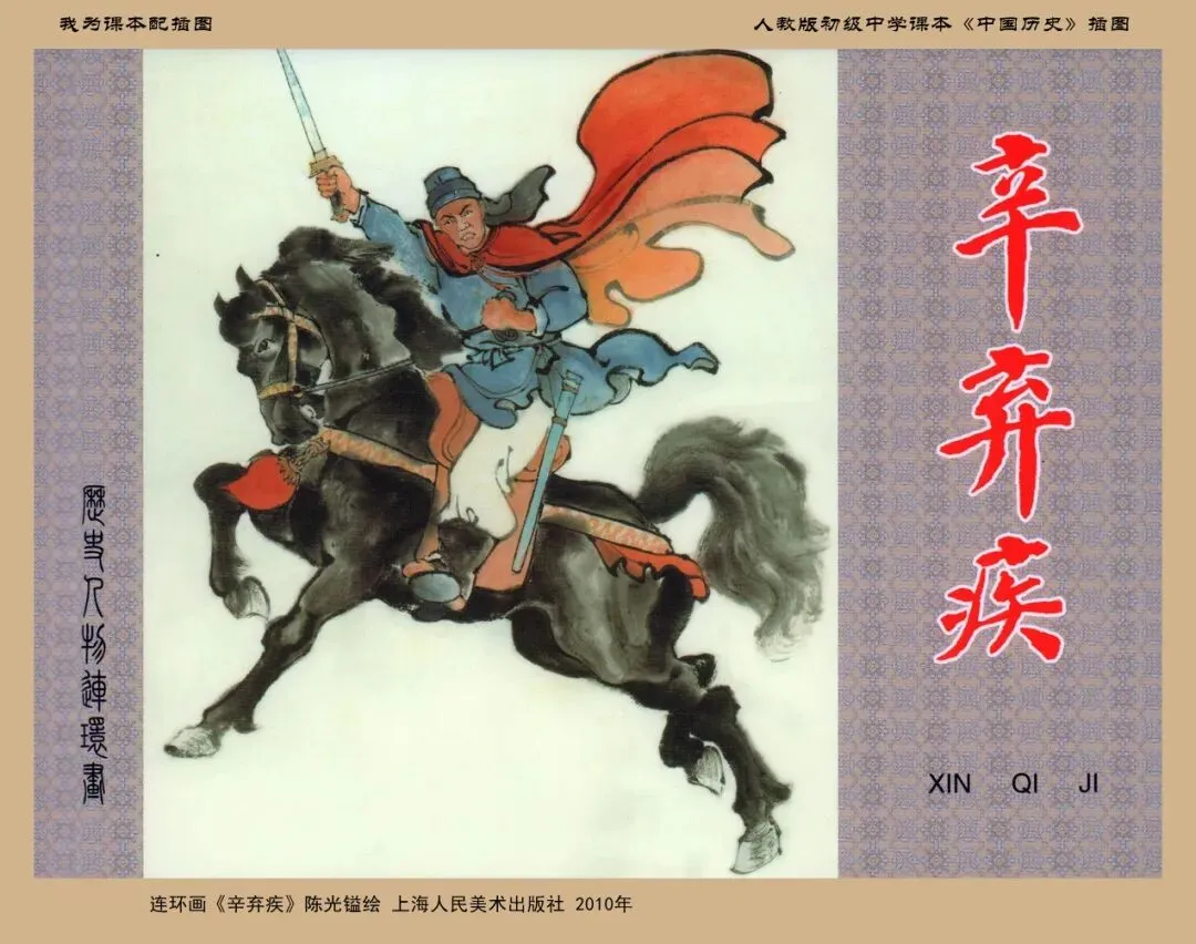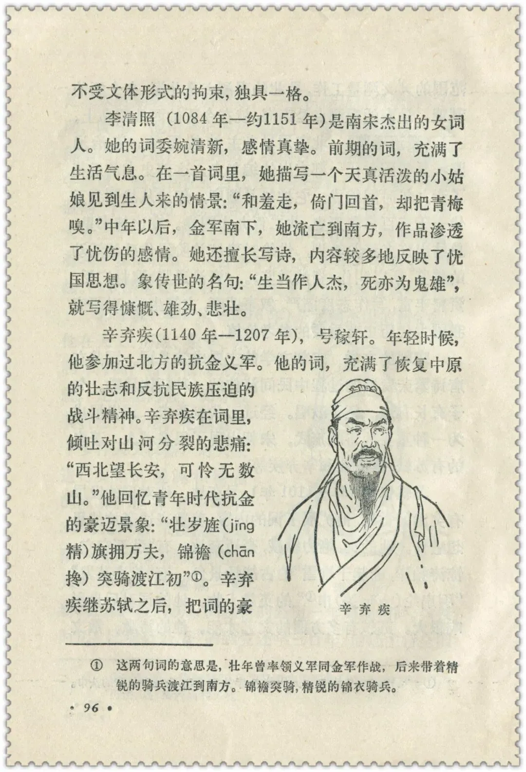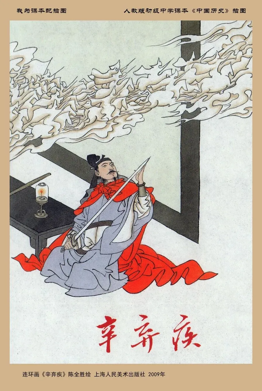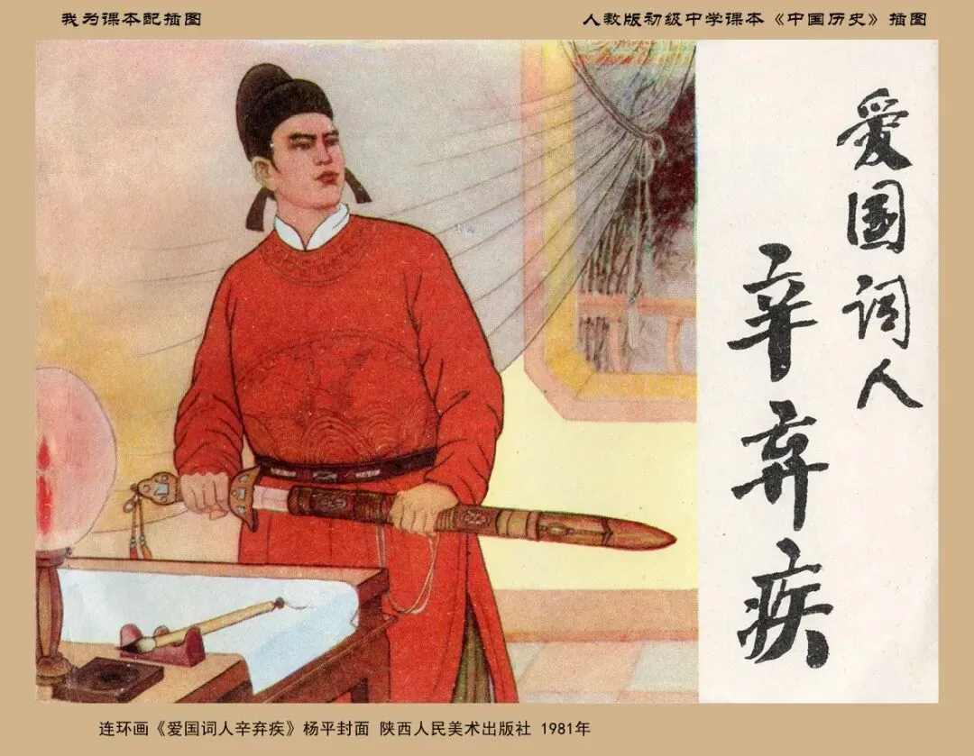 辛弃疾(1140年一1207年),号稼轩。年轻时候,他参加过北方的抗金义军。他的词,充满了恢复中原的壮志和反抗民族压迫的战斗精神。辛弃疾在词里,倾吐对山河分裂的悲痛:"西北望长安,可怜无数山。"他回忆青年时代抗金的豪迈景象:"壮岁旌旗拥万夫,锦襜突骑渡江初"。辛弃疾继苏轼之后,把词的豪放风格加以发扬光大。