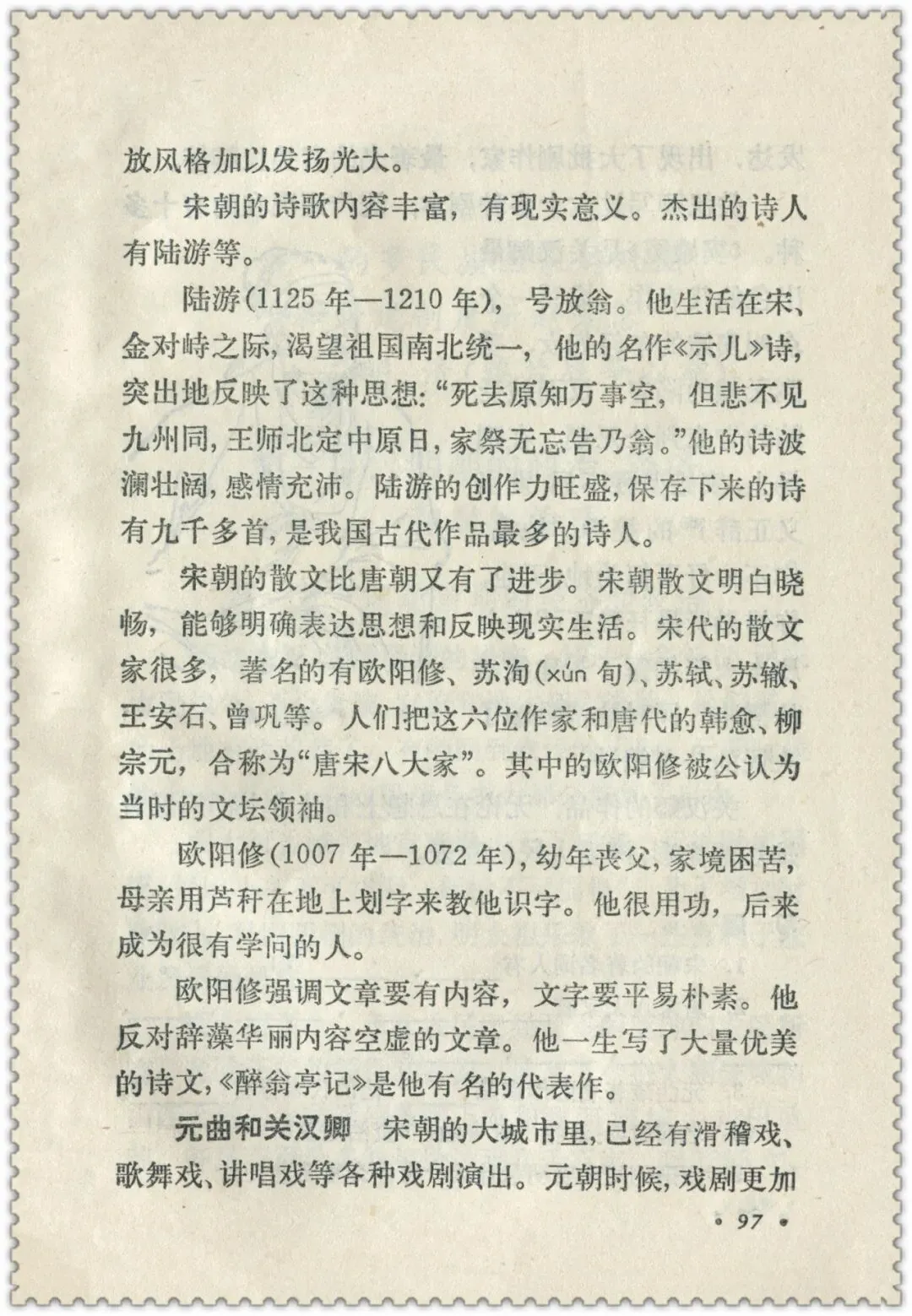 欧阳修强调文章要有内容,文字要平易朴素。他反对辞藻华丽内容空虚的文章。他一生写了大量优美的诗文,《醉翁亭记》是他有名的代表作。