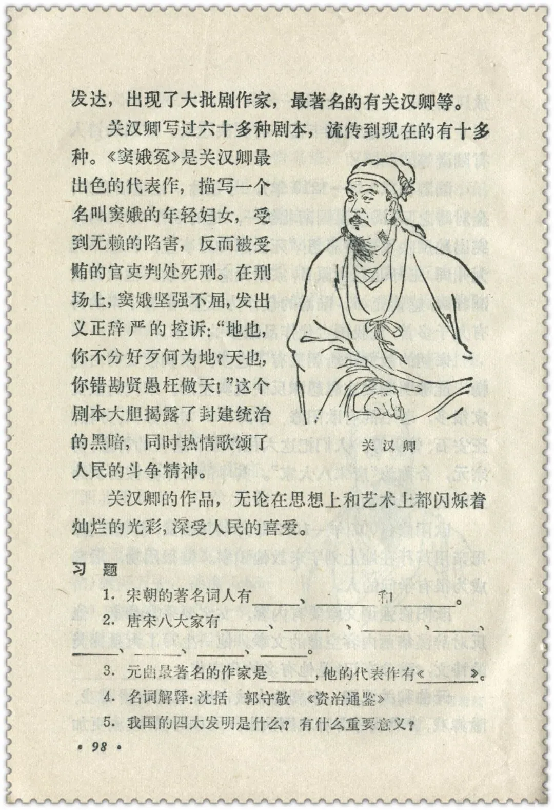 关汉卿写过六十多种剧本,流传到现在的有十多种。《窦娥冤》是关汉卿最出色的代表作,描写一个名叫窦娥的年轻妇女,受到无赖的陷害,反而被受贿的官吏判处死刑。在刑场上,窦娥坚强不屈,发出义正辞严的控诉:"地也,你不分好歹何为地?天也,你错勘贤愚枉做天!"这个剧本大胆揭露了封建统治的黑暗,同时热情歌颂了人民的斗争精神。